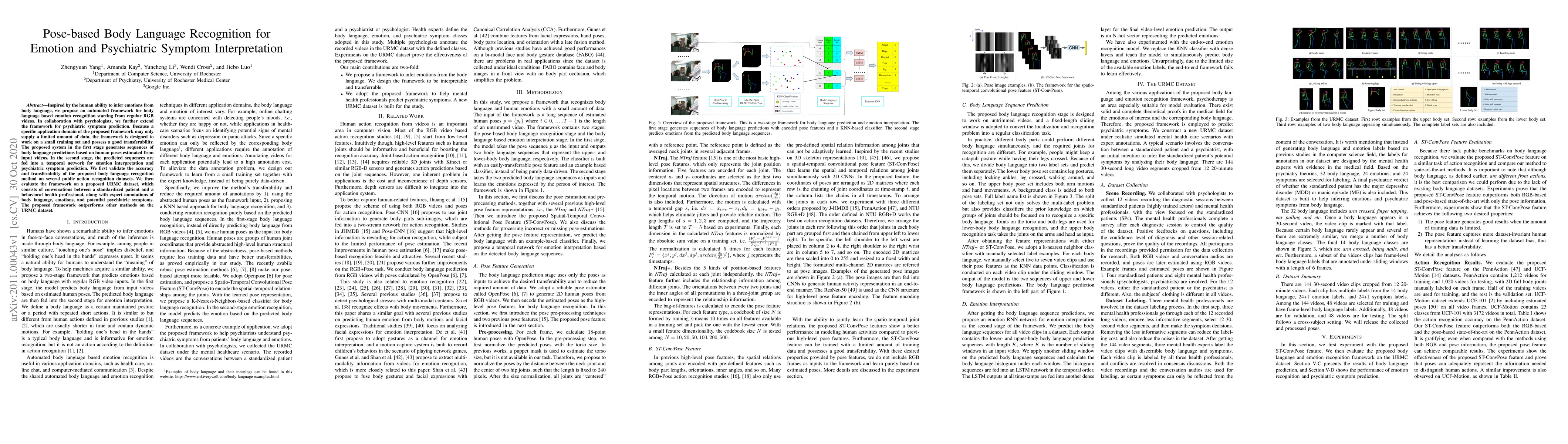 Inspired by the human ability to infer emotions from body language, we propose an automated framework for body language based emotion recognition starting from regular RGB videos. In collaboration with psychologists, we further extend the framework for psychiatric symptom prediction. Because a specific application domain of the proposed framework may only supply a limited amount of data, the framework is designed to work on a small training set and possess a good transferability. The proposed system in the first stage generates sequences of body language predictions based on human poses estimated from input videos. In the second stage, the predicted sequences are fed into a temporal network for emotion interpretation and psychiatric symptom prediction. We first validate the accuracy and transferability of the proposed body language recognition method on several public action recognition datasets. We then evaluate the framework on a proposed URMC dataset, which consists of conversations between a standardized patient and a behavioral health professional, along with expert annotations of body language, emotions, and potential psychiatric symptoms. The proposed framework outperforms other methods on the URMC dataset.