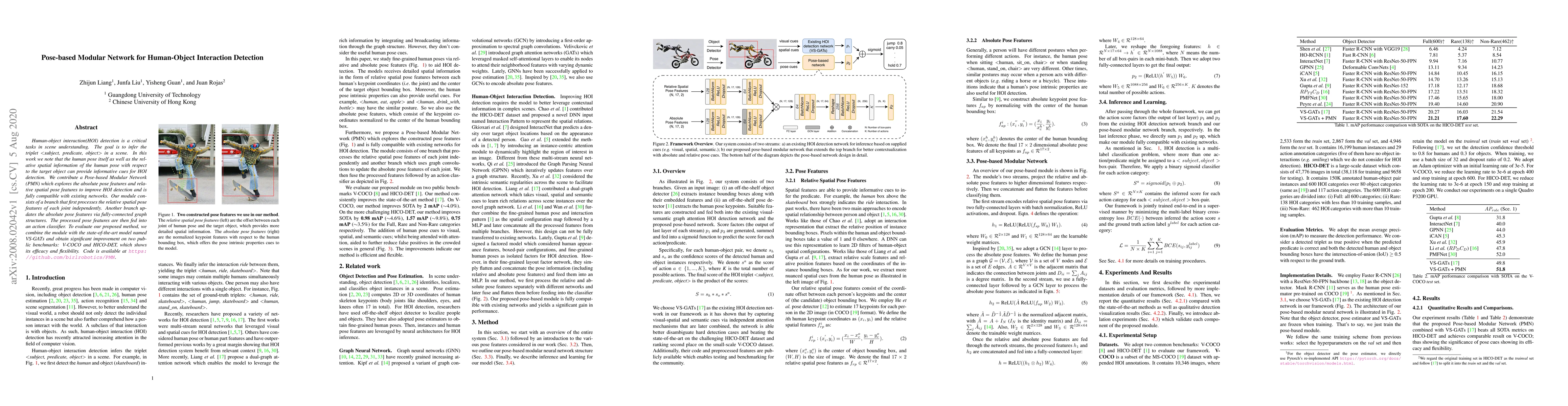 This paper proposes a Pose-based Modular Network (PMN) to enhance human-object interaction detection by leveraging both absolute and relative spatial pose features. The PMN integrates with existing networks, showing significant improvements on V-COCO and HICO-DET benchmarks.