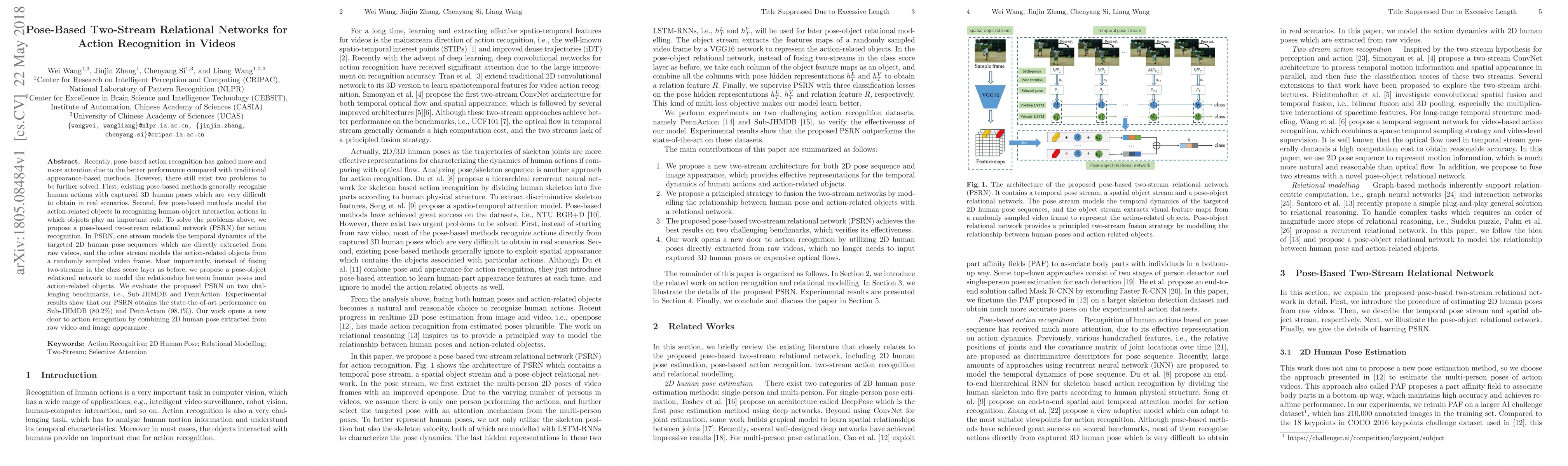 This paper proposes a pose-based two-stream relational network (PSRN) for action recognition in videos, addressing the challenges of obtaining 3D human poses and modeling human-object interactions. The PSRN uses 2D human pose sequences and objects from random frames, and introduces a novel pose-object relational network to model their interactions, achieving state-of-the-art performance on Sub-JHMDB and PennAction benchmarks.