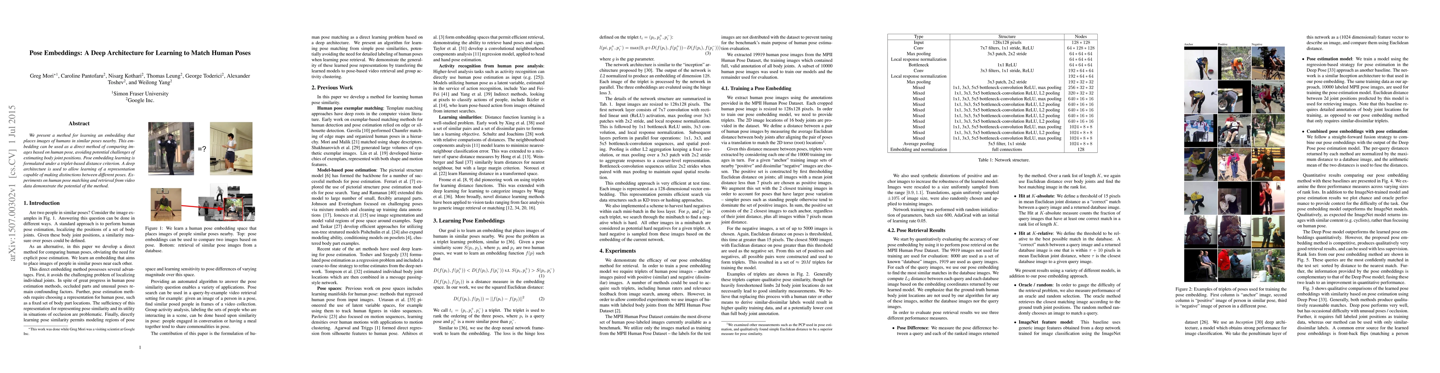 A new method learns to match human poses by creating an embedding that places similar pose images nearby, demonstrating potential for image comparison and retrieval from video data.