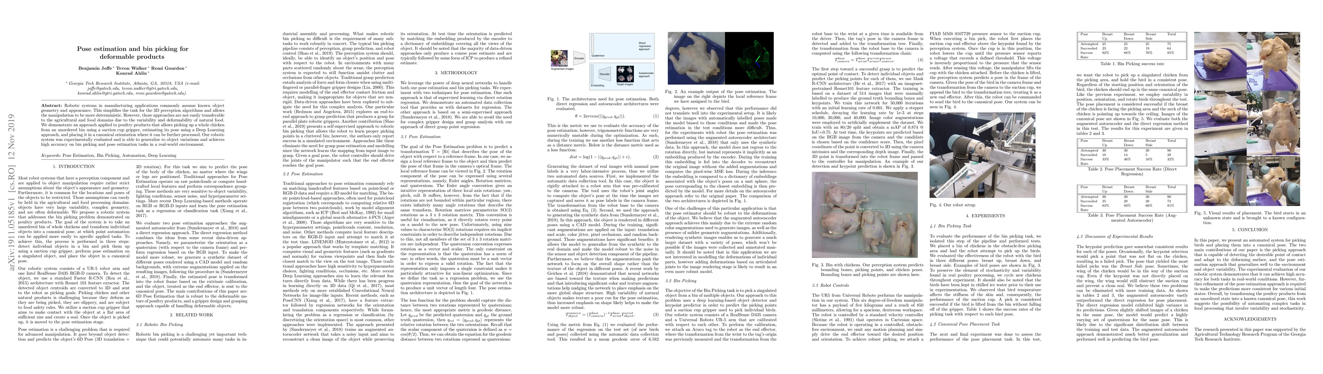 This paper presents a robotic system for bin picking and pose estimation of deformable poultry products using deep learning, enabling the manipulation of whole chickens in an unordered bin with high accuracy and generalization to object variations. Experimental results demonstrate the system's effectiveness in real-world agricultural and food applications.