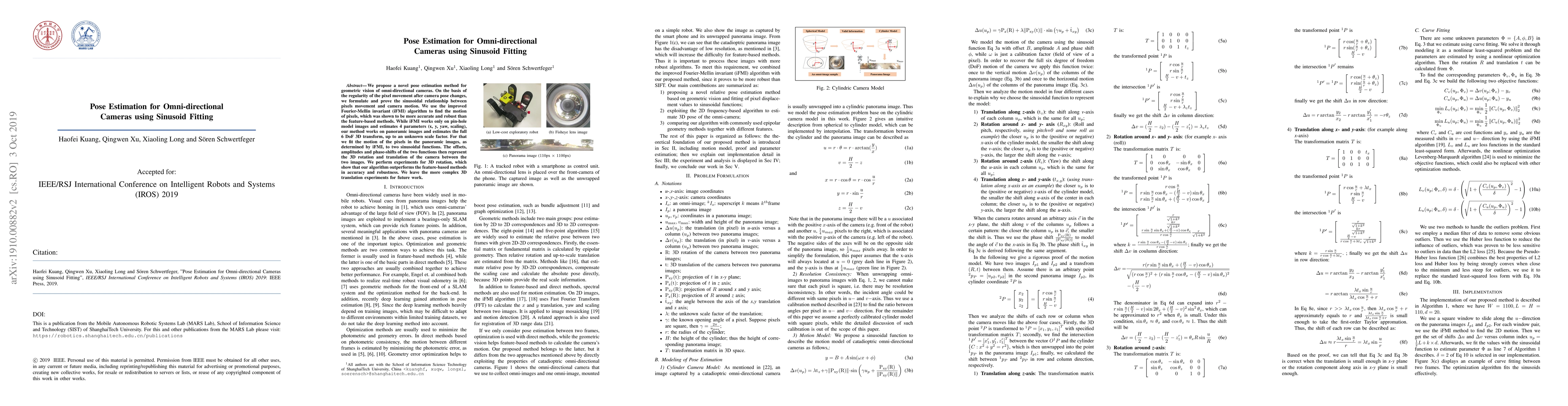 This paper introduces a novel pose estimation method for omni-directional cameras based on sinusoidal fitting, leveraging the iFMI algorithm for pixel motion analysis. The method estimates full 6 DoF 3D transformations from panoramic images, outperforming traditional feature-based methods in accuracy and robustness.
