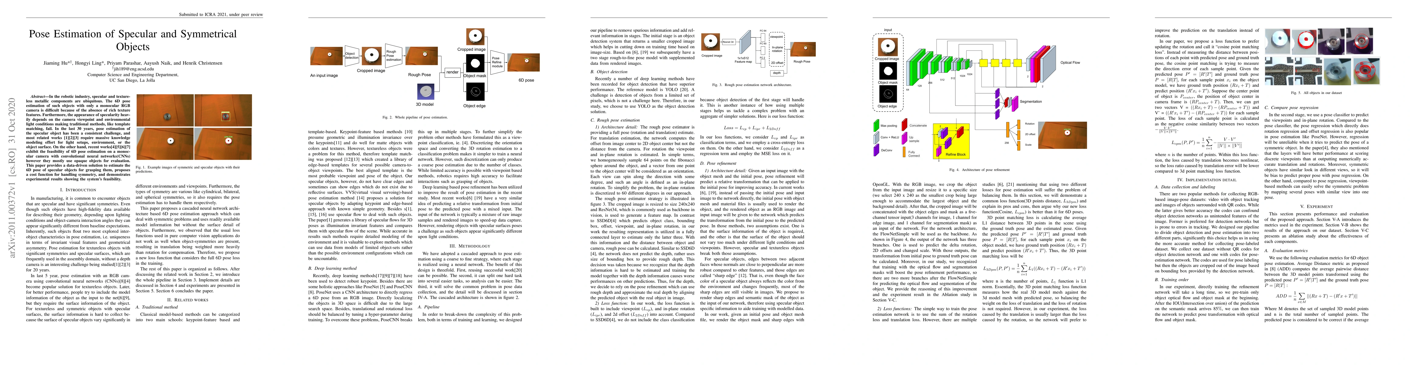 In the robotic industry, specular and textureless metallic components are ubiquitous. The 6D pose estimation of such objects with only a monocular RGB camera is difficult because of the absence of rich texture features. Furthermore, the appearance of specularity heavily depends on the camera viewpoint and environmental light conditions making traditional methods, like template matching, fail. In the last 30 years, pose estimation of the specular object has been a consistent challenge, and most related works require massive knowledge modeling effort for light setups, environment, or the object surface. On the other hand, recent works exhibit the feasibility of 6D pose estimation on a monocular camera with convolutional neural networks(CNNs) however they mostly use opaque objects for evaluation. This paper provides a data-driven solution to estimate the 6D pose of specular objects for grasping them, proposes a cost function for handling symmetry, and demonstrates experimental results showing the system's feasibility.