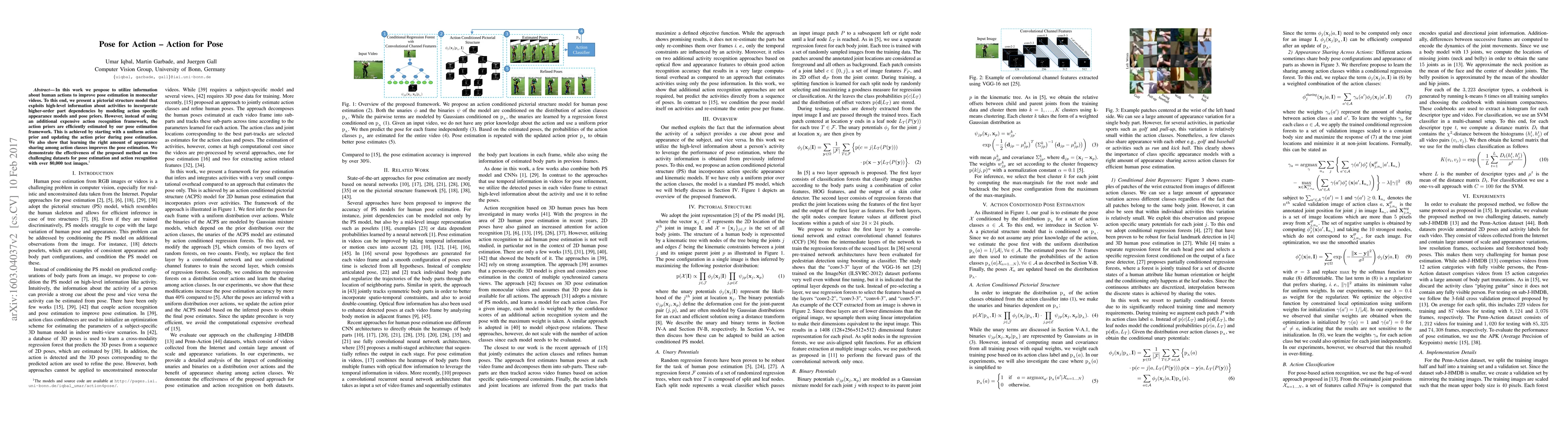 In this work we propose to utilize information about human actions to improve pose estimation in monocular videos. To this end, we present a pictorial structure model that exploits high-level information about activities to incorporate higher-order part dependencies by modeling action specific appearance models and pose priors. However, instead of using an additional expensive action recognition framework, the action priors are efficiently estimated by our pose estimation framework. This is achieved by starting with a uniform action prior and updating the action prior during pose estimation. We also show that learning the right amount of appearance sharing among action classes improves the pose estimation. We demonstrate the effectiveness of the proposed method on two challenging datasets for pose estimation and action recognition with over 80,000 test images.