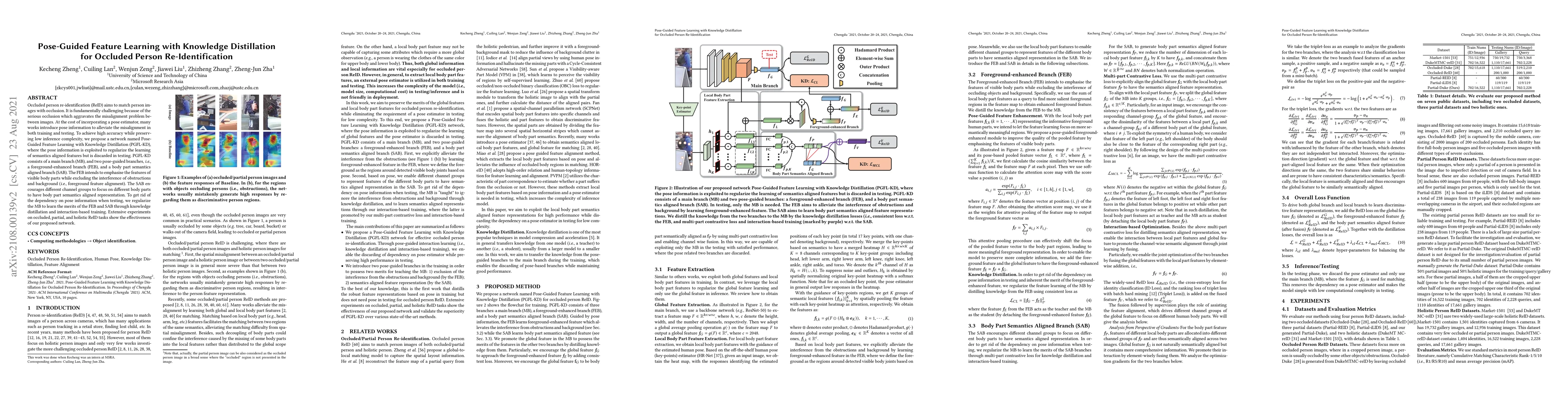 This paper proposes Pose-Guided Feature Learning with Knowledge Distillation (PGFL-KD) for occluded person re-identification, utilizing pose information during training to enhance feature learning while discarding it during testing to maintain low inference complexity. The network includes a main branch and two pose-guided branches to focus on visible parts and body part semantics, achieving effective performance in occluded re-identification tasks.