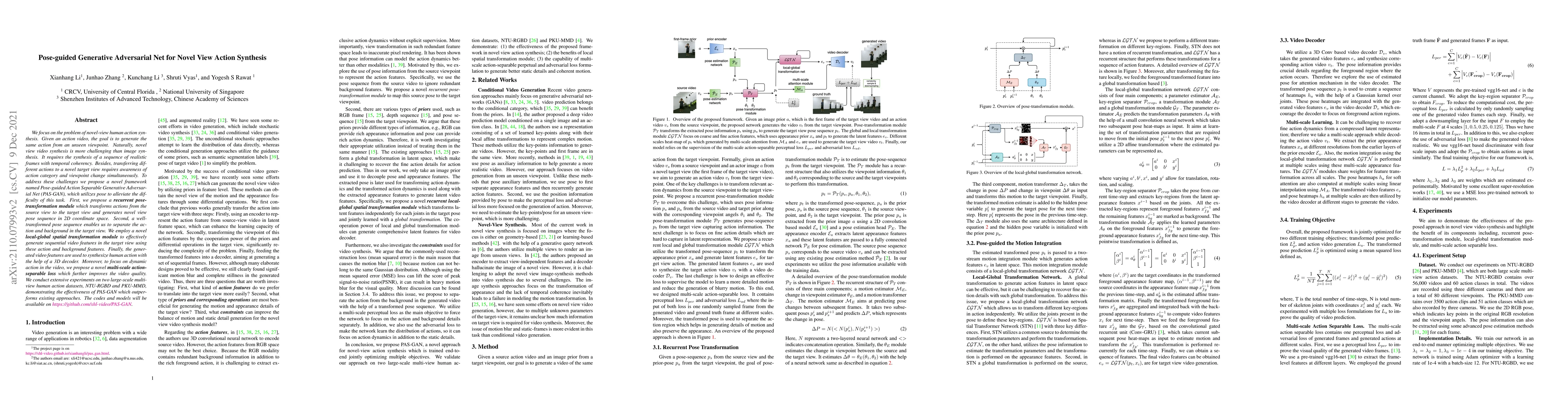 This paper proposes a Pose-guided Action Separable Generative Adversarial Net (PAS-GAN) to synthesize novel view action videos by transforming source view actions into target view poses using a recurrent pose-transformation module. The framework separates actions from backgrounds and employs a local-global spatial transformation module to generate sequential video features, ultimately synthesizing high-quality dynamic action videos.