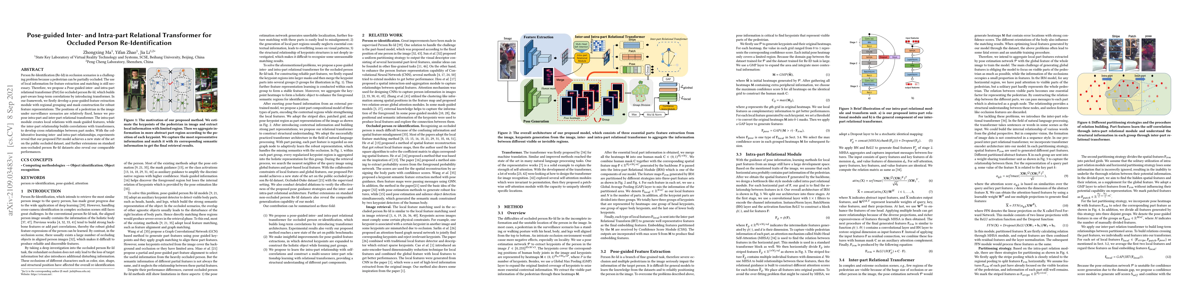 This paper proposes a Pose-guided inter- and intra-part relational transformer (Pirt) for occluded person Re-Identification, leveraging local information and transformers to build part-aware long-term correlations, achieving state-of-the-art results on occluded datasets and competitive performance on non-occluded datasets.