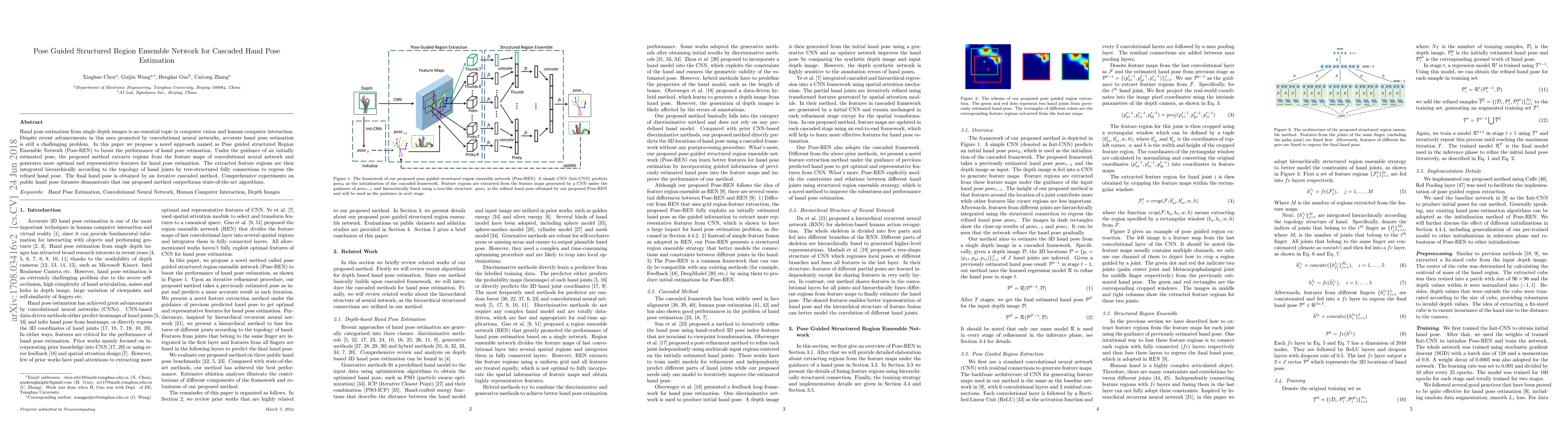 This paper proposes a Pose guided structured Region Ensemble Network (Pose-REN) to enhance hand pose estimation from depth images. The method extracts optimal features guided by an initial pose estimate and integrates them hierarchically via tree-structured connections, followed by iterative refinement to achieve superior performance compared to existing algorithms.
