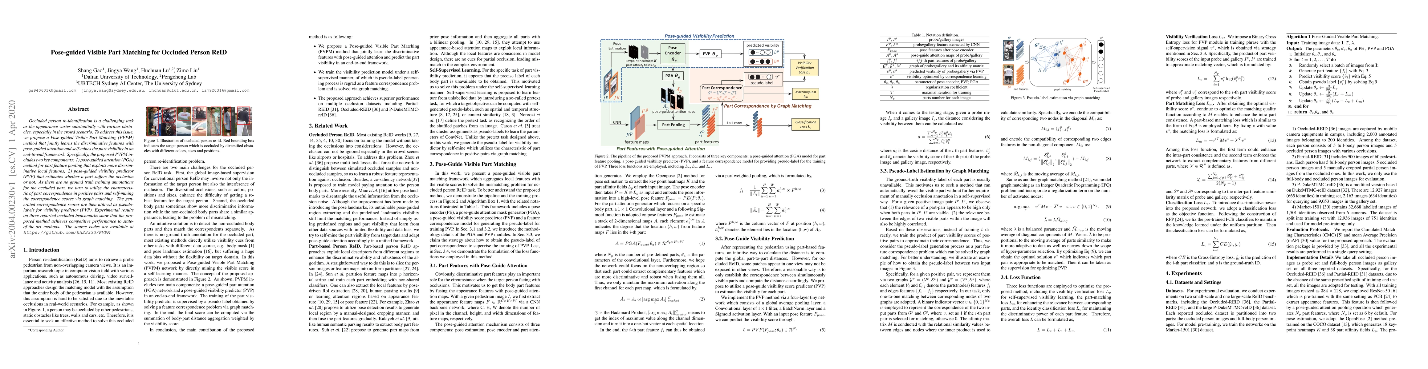 The paper proposes a Pose-guided Visible Part Matching (PVPM) method for occluded person re-identification, utilizing pose-guided attention and self-mining visibility predictors to enhance discriminative feature learning. Experimental results demonstrate competitive performance against state-of-the-art methods on occluded benchmarks.