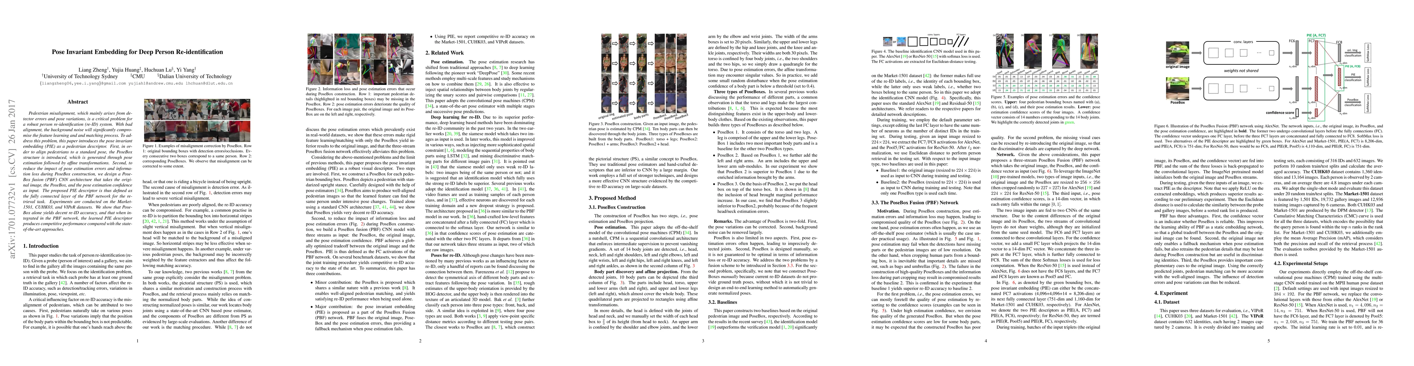 This paper proposes a pose invariant embedding (PIE) for person re-identification, addressing pedestrian misalignment through a PoseBox structure and a PoseBox fusion CNN. Experiments show that the PIE descriptor, derived from the PBF network, achieves competitive re-ID accuracy on multiple datasets.