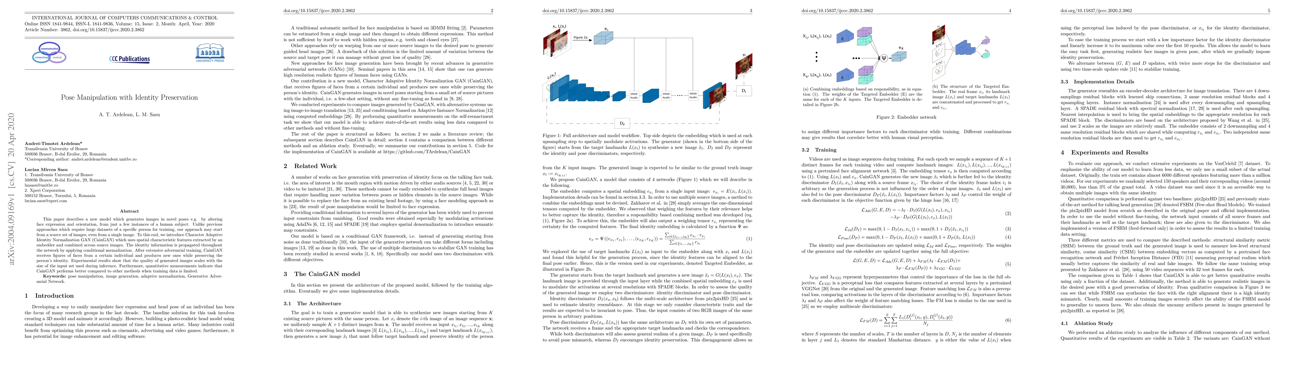 This paper describes a new model which generates images in novel poses e.g. by altering face expression and orientation, from just a few instances of a human subject. Unlike previous approaches which require large datasets of a specific person for training, our approach may start from a scarce set of images, even from a single image. To this end, we introduce Character Adaptive Identity Normalization GAN (CainGAN) which uses spatial characteristic features extracted by an embedder and combined across source images. The identity information is propagated throughout the network by applying conditional normalization. After extensive adversarial training, CainGAN receives figures of faces from a certain individual and produces new ones while preserving the person's identity. Experimental results show that the quality of generated images scales with the size of the input set used during inference. Furthermore, quantitative measurements indicate that CainGAN performs better compared to other methods when training data is limited.
