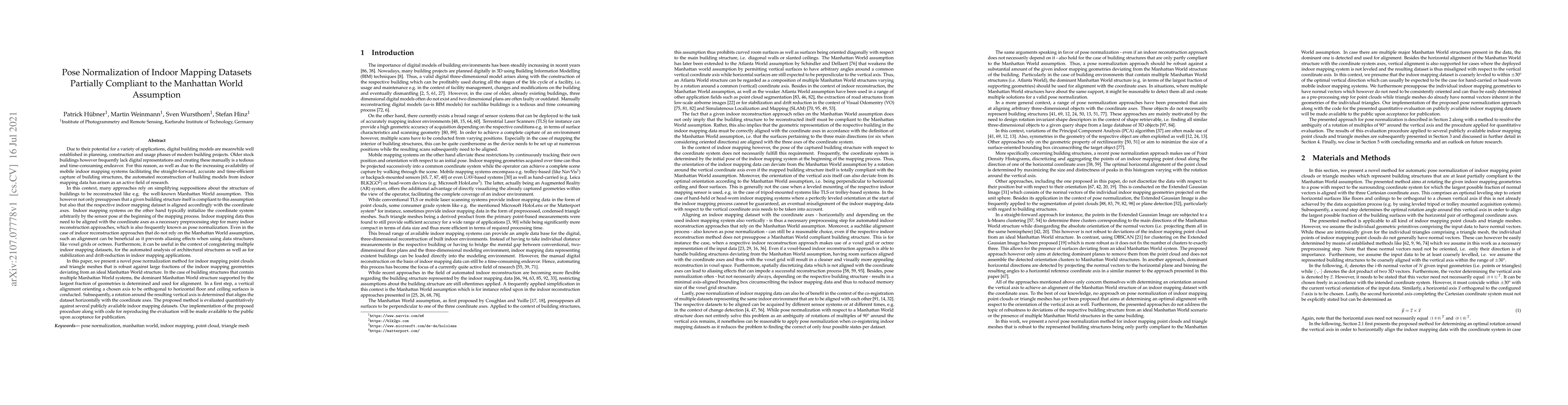 This paper introduces a pose normalization technique for indoor mappings that accommodates deviations from the Manhattan World assumption, determining the dominant structure for alignment. The method involves vertical and horizontal rotations for dataset normalization, and is evaluated against multiple datasets.