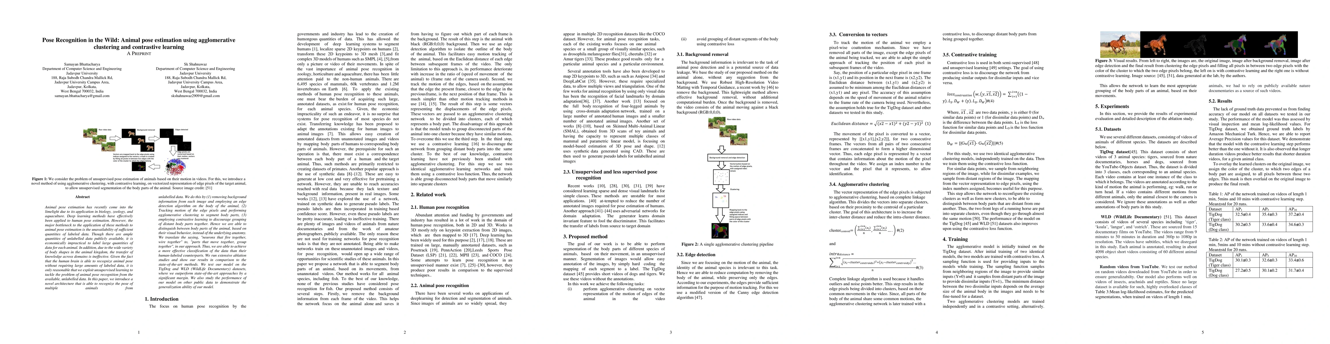 Animal pose estimation has recently come into the limelight due to its application in biology, zoology, and aquaculture. Deep learning methods have effectively been applied to human pose estimation. However, the major bottleneck to the application of these methods to animal pose estimation is the unavailability of sufficient quantities of labeled data. Though there are ample quantities of unlabelled data publicly available, it is economically impractical to label large quantities of data for each animal. In addition, due to the wide variety of body shapes in the animal kingdom, the transfer of knowledge across domains is ineffective. Given the fact that the human brain is able to recognize animal pose without requiring large amounts of labeled data, it is only reasonable that we exploit unsupervised learning to tackle the problem of animal pose recognition from the available, unlabelled data. In this paper, we introduce a novel architecture that is able to recognize the pose of multiple animals fromunlabelled data. We do this by (1) removing background information from each image and employing an edge detection algorithm on the body of the animal, (2) Tracking motion of the edge pixels and performing agglomerative clustering to segment body parts, (3) employing contrastive learning to discourage grouping of distant body parts together. Hence we are able to distinguish between body parts of the animal, based on their visual behavior, instead of the underlying anatomy. Thus, we are able to achieve a more effective classification of the data than their human-labeled counterparts. We test our model on the TigDog and WLD (WildLife Documentary) datasets, where we outperform state-of-the-art approaches by a significant margin. We also study the performance of our model on other public data to demonstrate the generalization ability of our model.