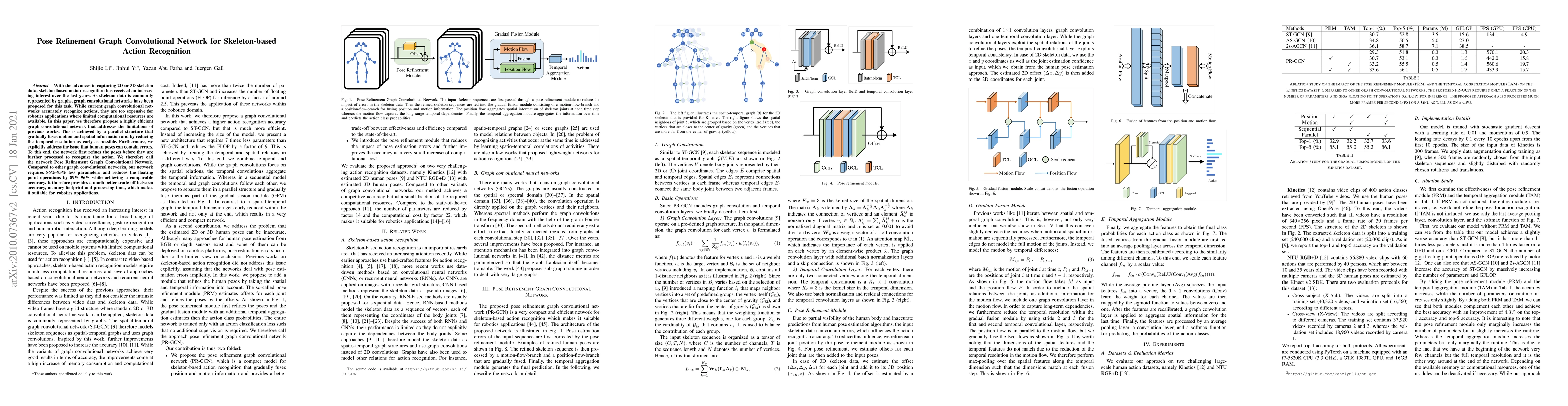 With the advances in capturing 2D or 3D skeleton data, skeleton-based action recognition has received an increasing interest over the last years. As skeleton data is commonly represented by graphs, graph convolutional networks have been proposed for this task. While current graph convolutional networks accurately recognize actions, they are too expensive for robotics applications where limited computational resources are available. In this paper, we therefore propose a highly efficient graph convolutional network that addresses the limitations of previous works. This is achieved by a parallel structure that gradually fuses motion and spatial information and by reducing the temporal resolution as early as possible. Furthermore, we explicitly address the issue that human poses can contain errors. To this end, the network first refines the poses before they are further processed to recognize the action. We therefore call the network Pose Refinement Graph Convolutional Network. Compared to other graph convolutional networks, our network requires 86\%-93\% less parameters and reduces the floating point operations by 89%-96% while achieving a comparable accuracy. It therefore provides a much better trade-off between accuracy, memory footprint and processing time, which makes it suitable for robotics applications.