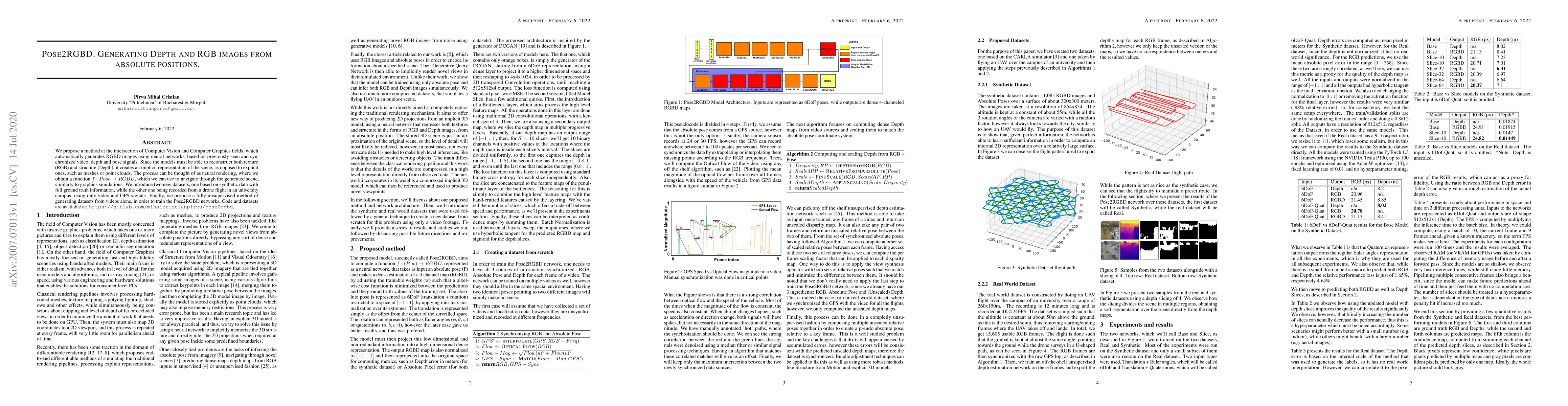 The paper proposes Pose2RGBD, a neural network method that generates RGBD images from absolute positions using synchronized video, depth, and pose signals. It introduces two datasets: a synthetic one from CARLA simulator and a real-world dataset captured by a drone flight in an university campus. The method uses an unsupervised approach to train the network with video footage alone.