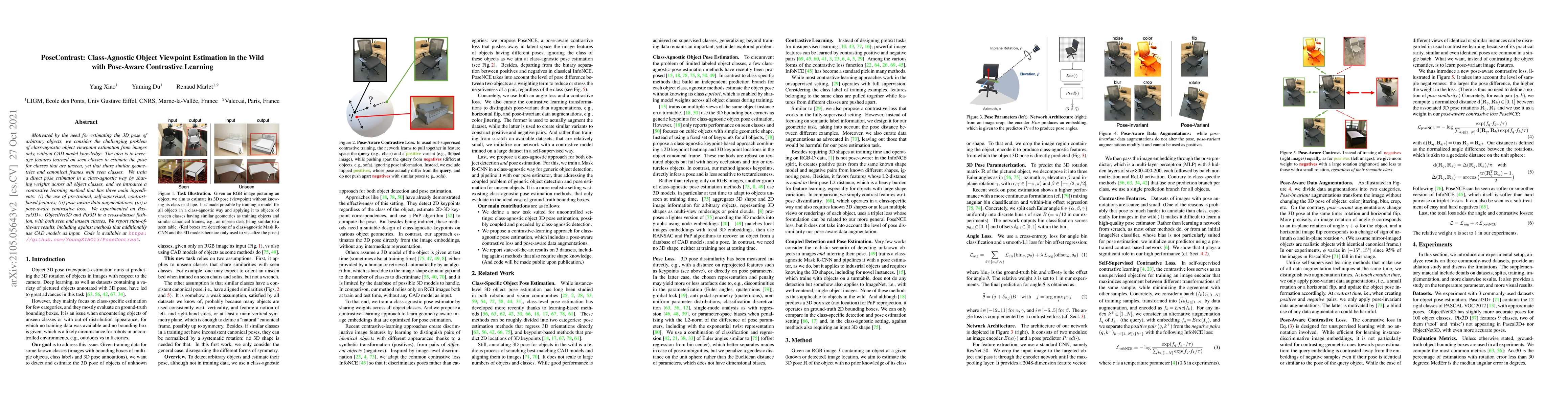This paper proposes PoseContrast, a class-agnostic method for estimating 3D object poses from images alone, leveraging contrastive learning and shared weights across classes. It achieves state-of-the-art results on multiple datasets by using self-supervised features, pose-aware augmentations, and a novel contrastive loss.