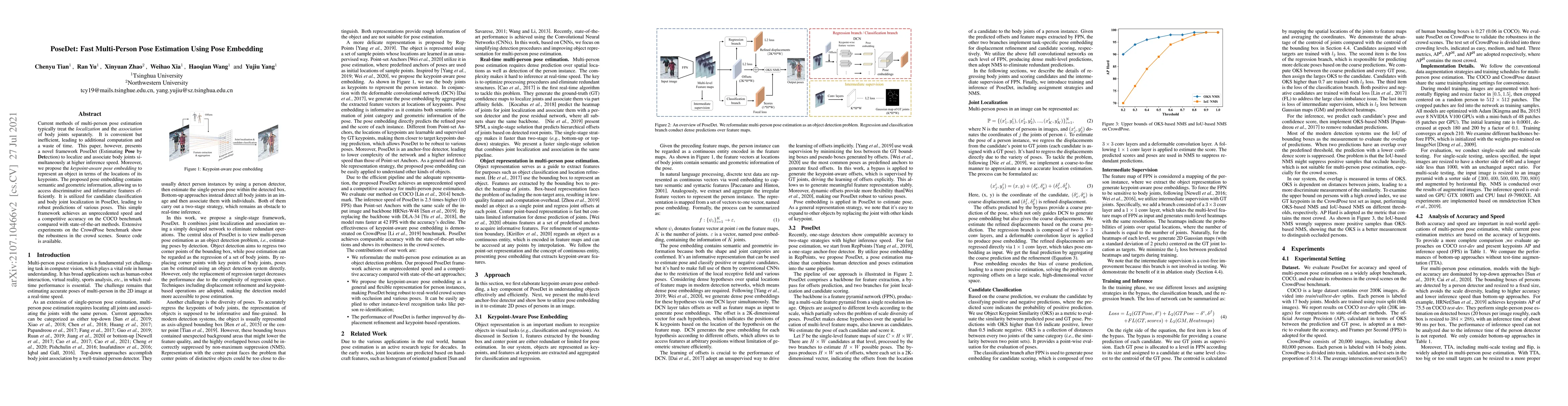 Current methods of multi-person pose estimation typically treat the localization and the association of body joints separately. It is convenient but inefficient, leading to additional computation and a waste of time. This paper, however, presents a novel framework PoseDet (Estimating Pose by Detection) to localize and associate body joints simultaneously at higher inference speed. Moreover, we propose the keypoint-aware pose embedding to represent an object in terms of the locations of its keypoints. The proposed pose embedding contains semantic and geometric information, allowing us to access discriminative and informative features efficiently. It is utilized for candidate classification and body joint localization in PoseDet, leading to robust predictions of various poses. This simple framework achieves an unprecedented speed and a competitive accuracy on the COCO benchmark compared with state-of-the-art methods. Extensive experiments on the CrowdPose benchmark show the robustness in the crowd scenes. Source code is available.