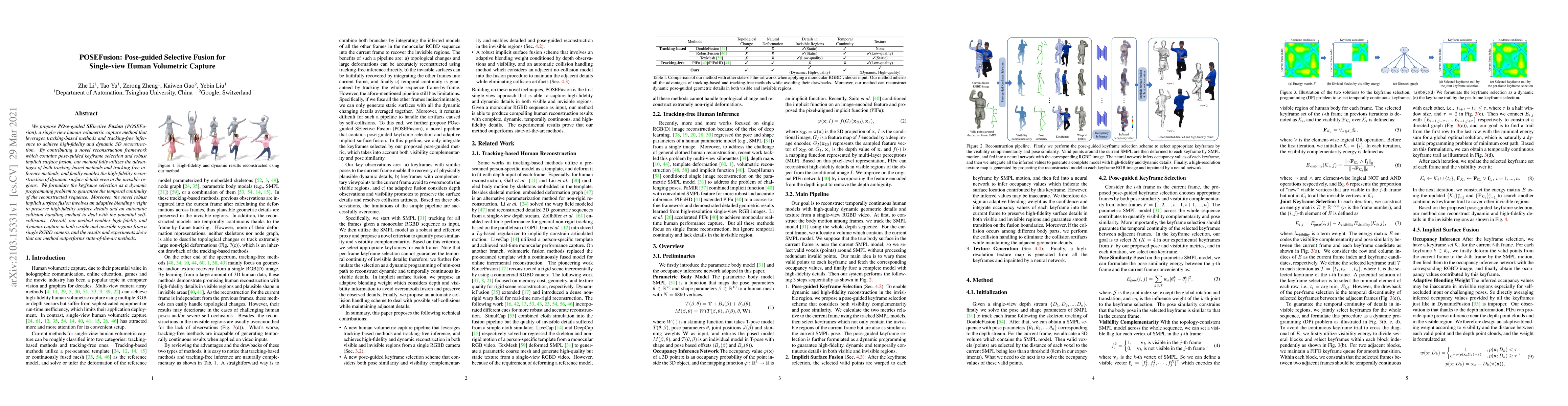 POSEFusion is a single-view human volumetric capture method that combines tracking-based and tracking-free techniques for high-fidelity 3D reconstruction. It uses pose-guided keyframe selection and robust implicit surface fusion to achieve dynamic and detailed reconstructions, even in invisible regions.