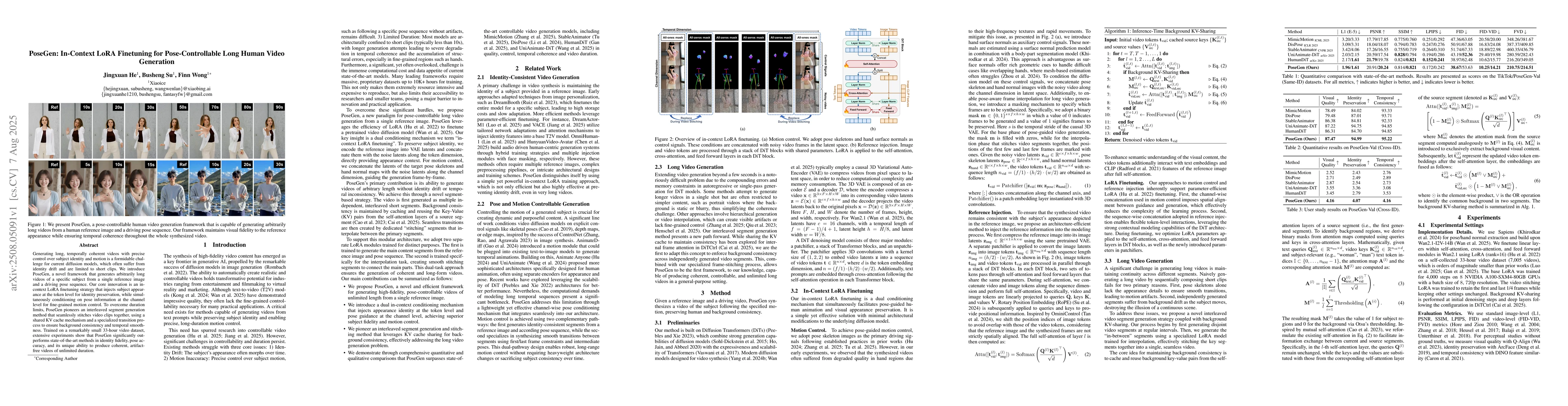 Generating long, temporally coherent videos with precise control over subject identity and motion is a formidable challenge for current diffusion models, which often suffer from identity drift and are limited to short clips. We introduce PoseGen, a novel framework that generates arbitrarily long videos of a specific subject from a single reference image and a driving pose sequence. Our core innovation is an in-context LoRA finetuning strategy that injects subject appearance at the token level for identity preservation, while simultaneously conditioning on pose information at the channel level for fine-grained motion control. To overcome duration limits, PoseGen pioneers an interleaved segment generation method that seamlessly stitches video clips together, using a shared KV cache mechanism and a specialized transition process to ensure background consistency and temporal smoothness. Trained on a remarkably small 33-hour video dataset, extensive experiments show that PoseGen significantly outperforms state-of-the-art methods in identity fidelity, pose accuracy, and its unique ability to produce coherent, artifact-free videos of unlimited duration.