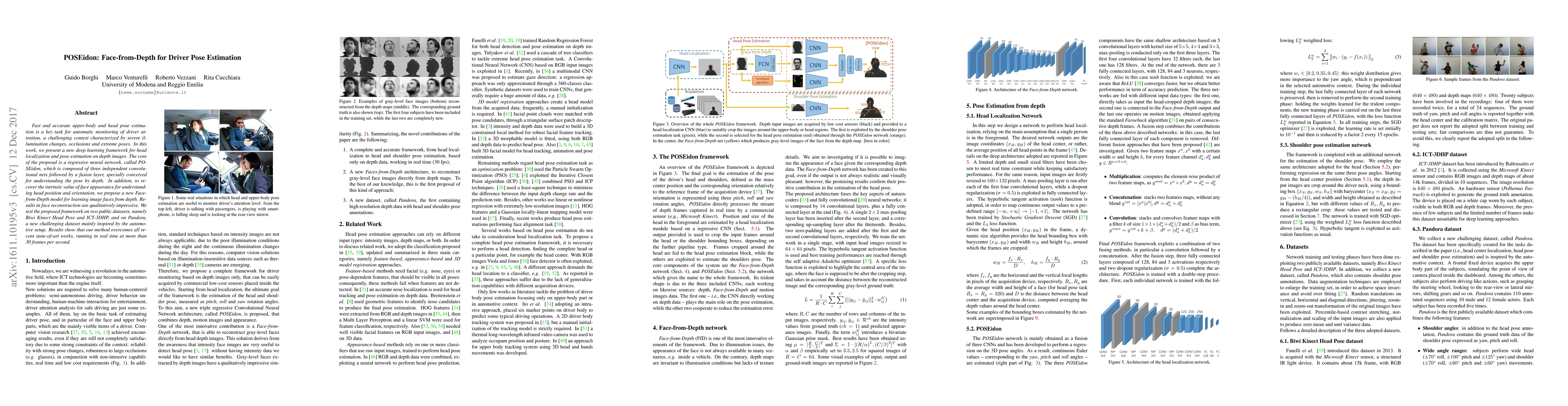 POSEidon presents a deep learning framework for real-time upper-body and head pose estimation using depth images, achieving superior performance in challenging conditions like severe illumination changes and occlusions. The method combines a regression neural network with a Face-from-Depth approach for accurate head localization and pose estimation.