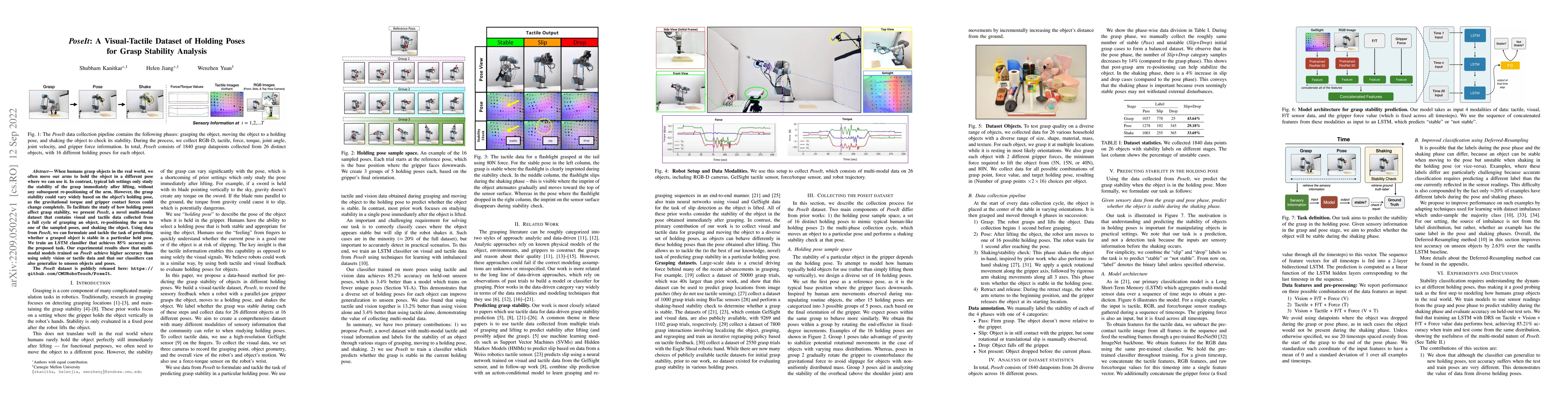 PoseIt is a novel visual-tactile dataset capturing the full cycle of grasping, repositioning, and shaking objects to study grasp stability across different holding poses. An LSTM classifier trained on this dataset achieves 85% accuracy in predicting grasp stability, demonstrating that multi-modal models outperform single-modal approaches and generalize well to new objects and poses.