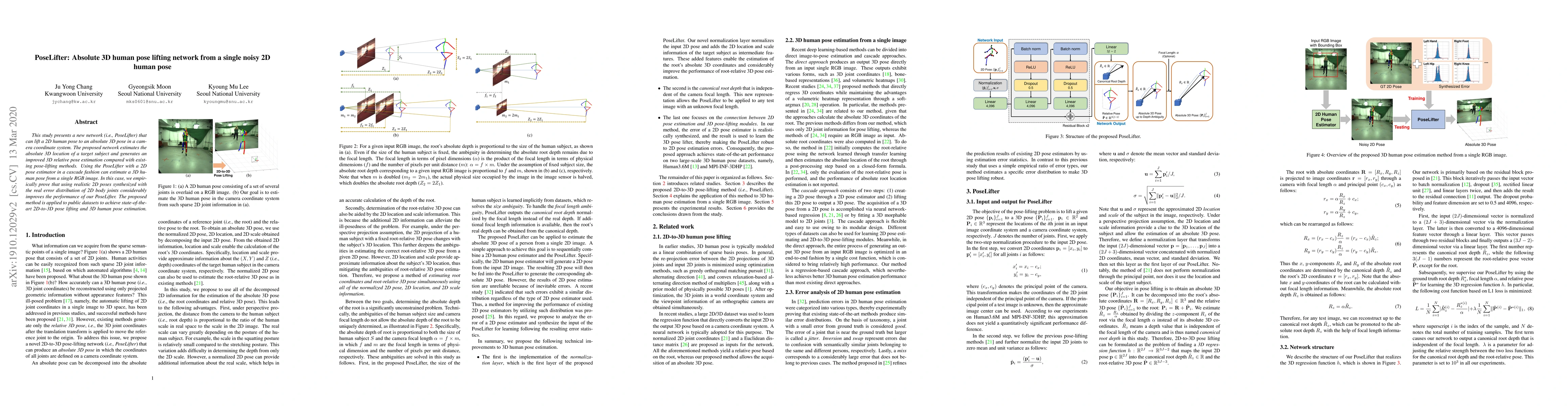 Summary: PoseLifter is a novel network designed to convert a noisy 2D human pose into an accurate absolute 3D pose in a camera coordinate system. When used in a cascade with a 2D pose estimator, it achieves state-of-the-art results in 3D human pose estimation from a single RGB image, especially when trained with realistic synthetic 2D poses.