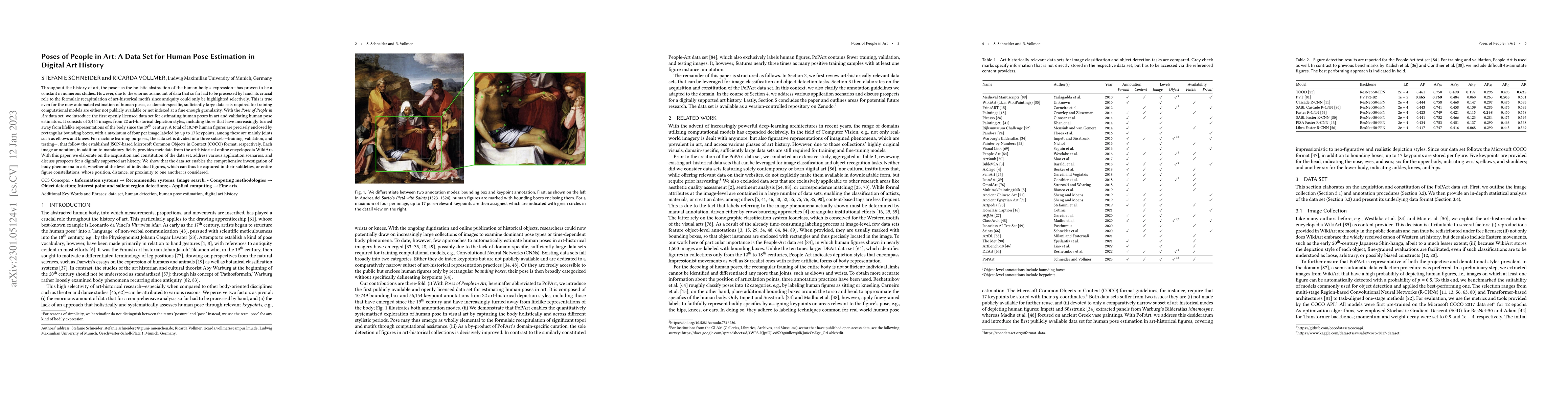This paper introduces the Poses of People in Art data set, a comprehensive collection of 2,454 images from 22 art-historical styles, aimed at facilitating human pose estimation in digital art history. The dataset includes 10,749 human figures annotated with up to 17 keypoints, enabling detailed analysis of human poses across different artistic periods.