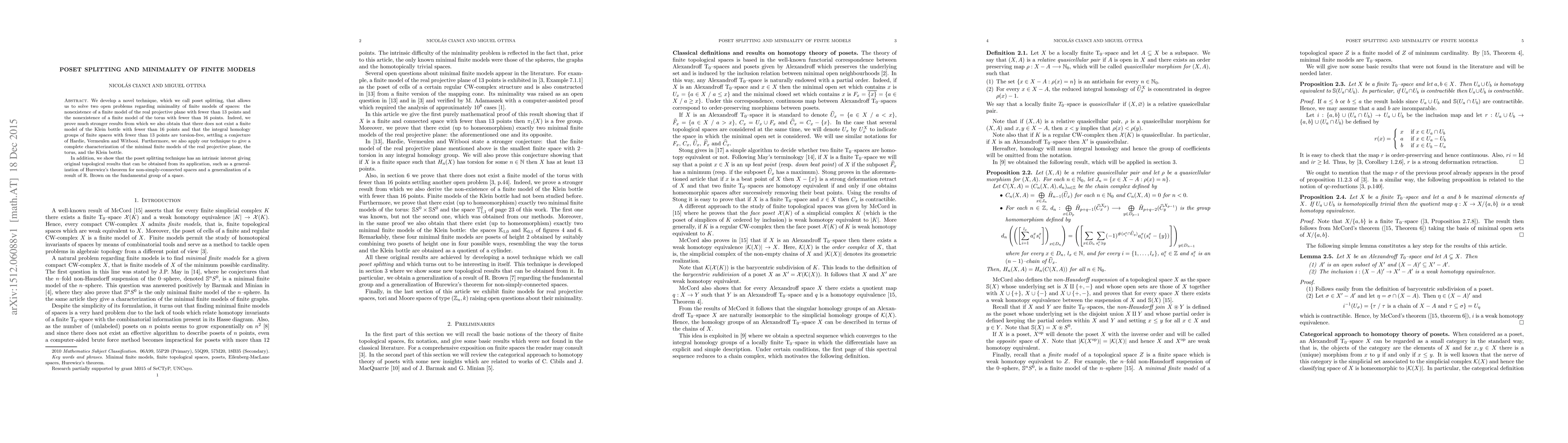 We develop a novel technique, which we call poset splitting, that allows us to solve two open problems regarding minimality of finite models of spaces: the nonexistence of a finite model of the real projective plane with fewer than 13 points and the nonexistence of a finite model of the torus with fewer than 16 points. Indeed, we prove much stronger results from which we also obtain that there does not exist a finite model of the Klein bottle with fewer than 16 points and that the integral homology groups of finite spaces with fewer than 13 points are torsion-free, settling a conjecture of Hardie, Vermeulen and Witbooi. Furthermore, we also apply our technique to give a complete characterization of the minimal finite models of the real projective plane, the torus, and the Klein bottle. In addition, we show that the poset splitting technique has an intrinsic interest giving original topological results that can be obtained from its application, such as a generalization of Hurewicz's theorem for non-simply-connected spaces and a generalization of a result of R. Brown on the fundamental group of a space.