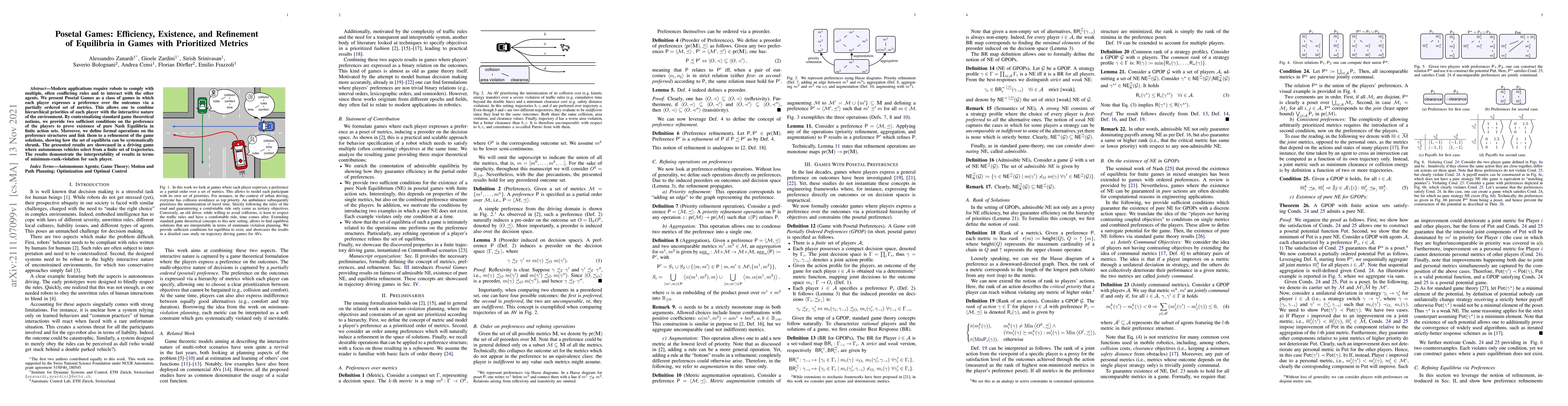 Researchers introduce Posetal Games, a framework for games with prioritized metrics, to study efficiency, existence, and refinement of equilibria in multi-agent systems. The work provides conditions for the existence of pure Nash Equilibria and demonstrates its applicability in autonomous vehicle trajectory selection.