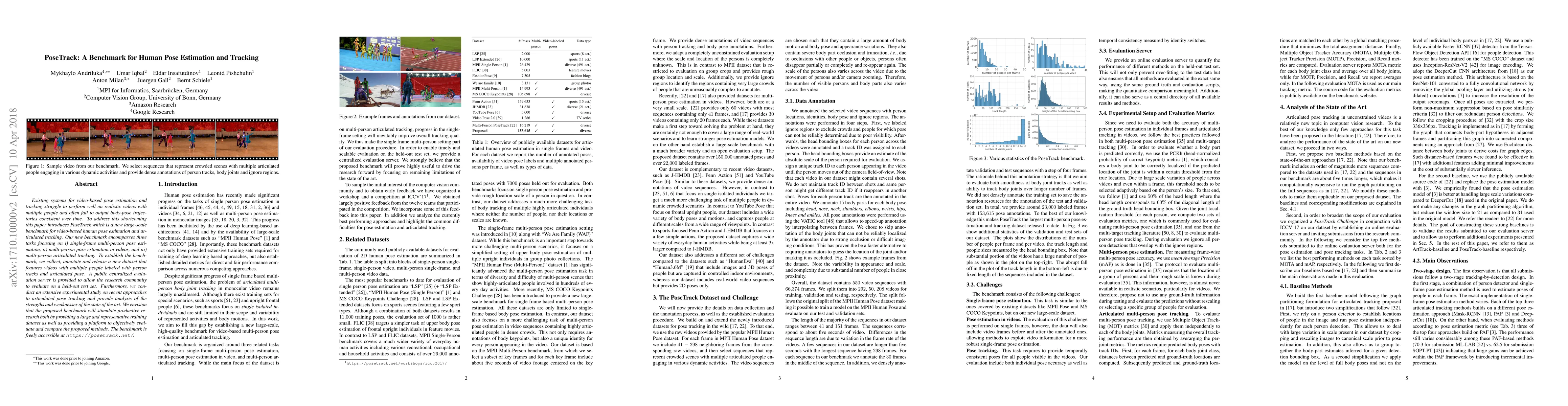 "PoseTrack" establishes a new benchmark for human pose estimation and tracking, featuring three competition tracks and a large-scale dataset to advance research in activity recognition and social signal processing. The benchmark aims to foster community collaboration and objective method evaluation.
