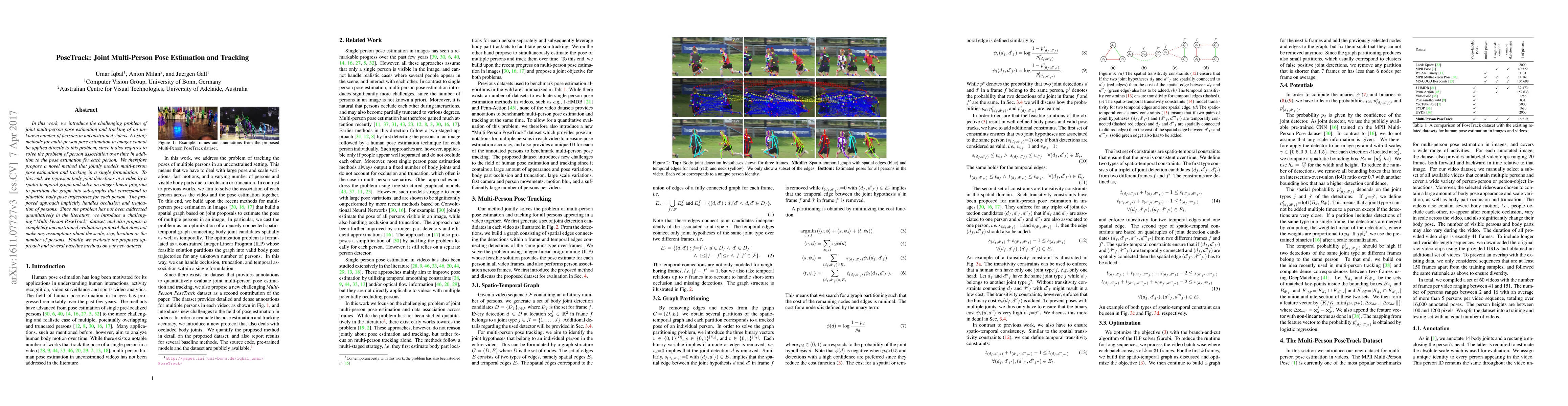This paper proposes a novel method for joint multi-person pose estimation and tracking in unconstrained videos, addressing the challenge of person association over time. It introduces a spatio-temporal graph and an integer linear program to model body joint detections, and evaluates the approach on a new "Multi-Person PoseTrack" dataset with an unconstrained evaluation protocol.