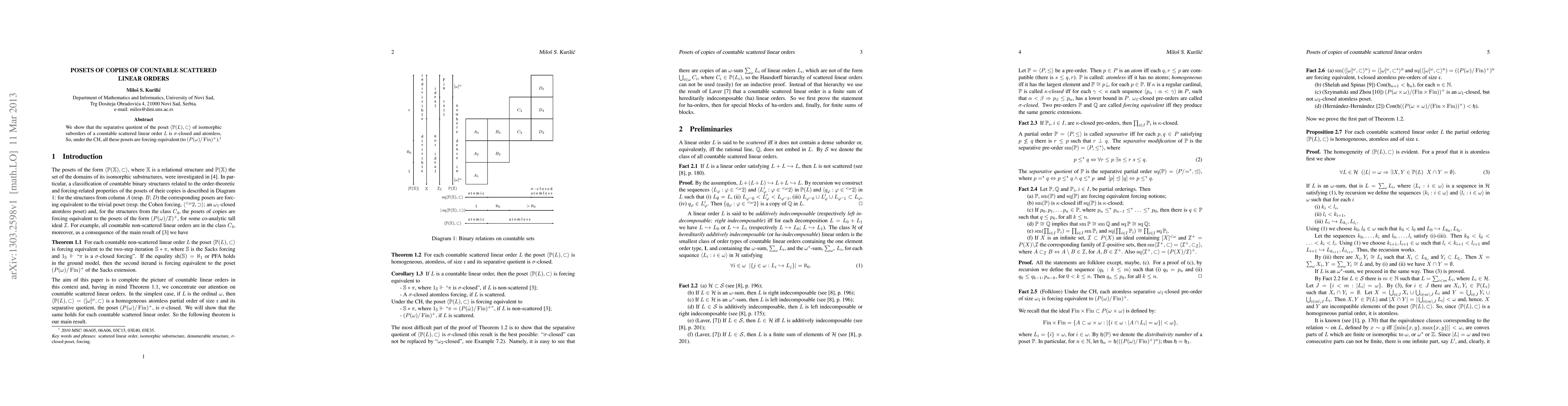 Summary: The paper demonstrates that the separative quotient of the poset of isomorphic suborders of a countable scattered linear order is σ-closed and atomless, and under the Continuum Hypothesis, all such posets are forcing-equivalent to P(ω)/Fin.