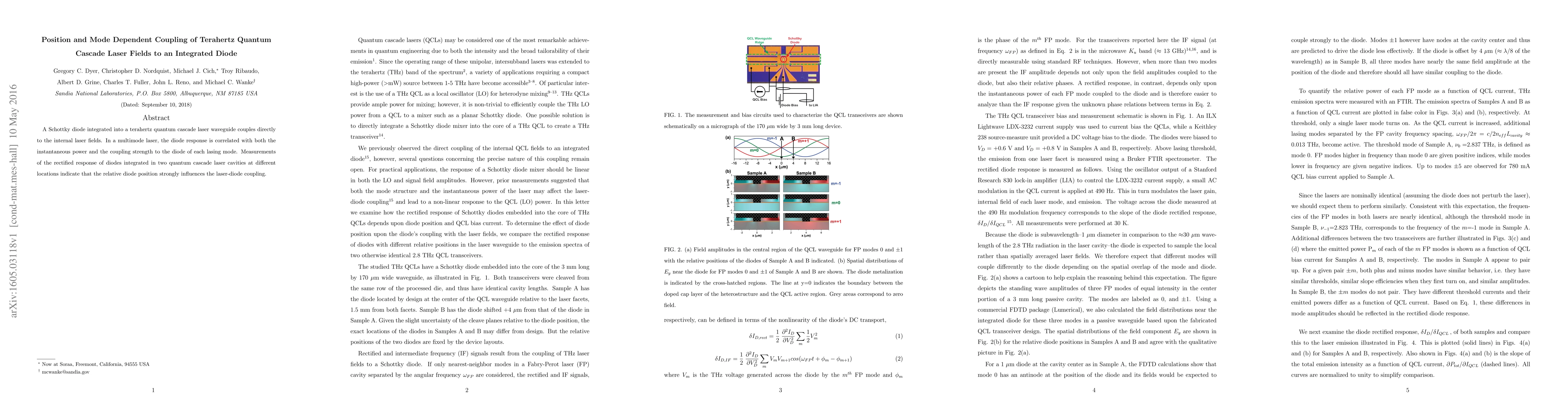 A Schottky diode integrated into a terahertz quantum cascade laser waveguide couples directly to the internal laser fields. In a multimode laser, the diode response is correlated with both the instantaneous power and the coupling strength to the diode of each lasing mode. Measurements of the rectified response of diodes integrated in two quantum cascade laser cavities at different locations indicate that the relative diode position strongly influences the laser-diode coupling.