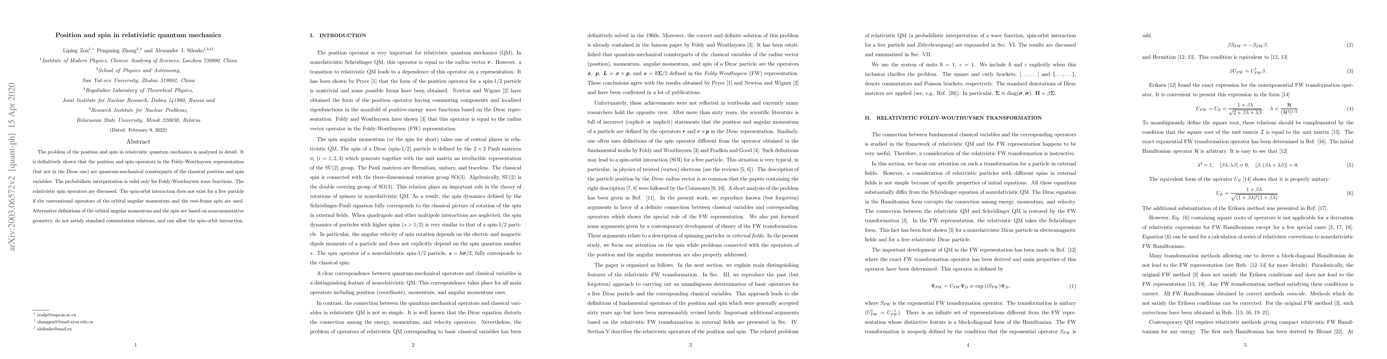 The problem of the position and spin in relativistic quantum mechanics is analyzed in detail. It is definitively shown that the position and spin operators in the Foldy-Wouthuysen representation (but not in the Dirac one) are quantum-mechanical counterparts of the classical position and spin variables. The probabilistic interpretation is valid only for Foldy-Wouthuysen wave functions. The relativistic spin operators are discussed. The spin-orbit interaction does not exist for a free particle if the conventional operators of the orbital angular momentum and the rest-frame spin are used. Alternative definitions of the orbital angular momentum and the spin are based on noncommutative geometry, do not satisfy standard commutation relations, and can allow the spin-orbit interaction.