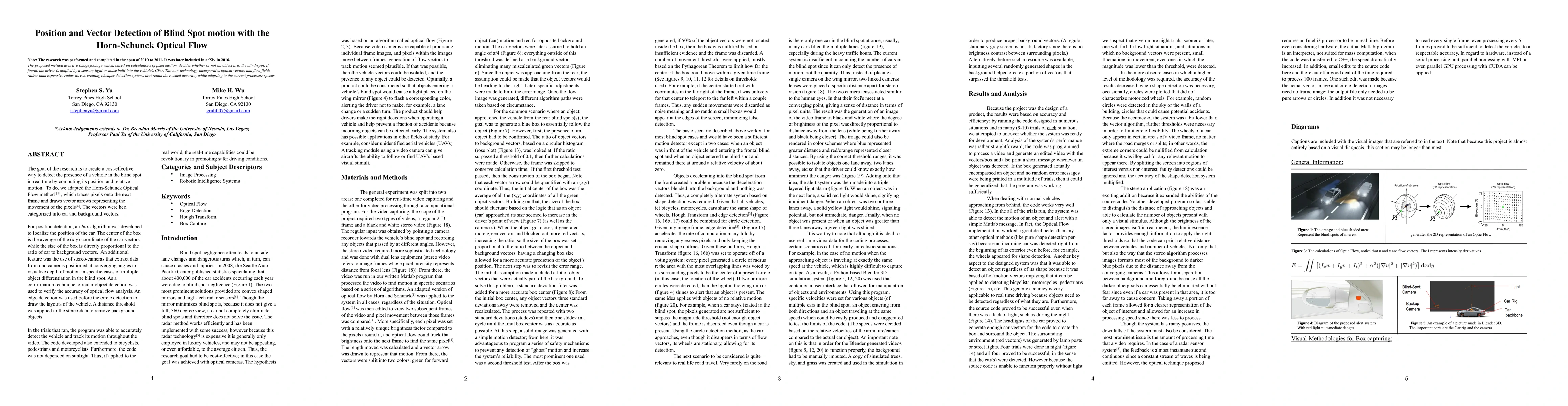 The proposed method uses live image footage which, based on calculations of pixel motion, decides whether or not an object is in the blind-spot. If found, the driver is notified by a sensory light or noise built into the vehicle's CPU. The new technology incorporates optical vectors and flow fields rather than expensive radar-waves, creating cheaper detection systems that retain the needed accuracy while adapting to the current processor speeds.