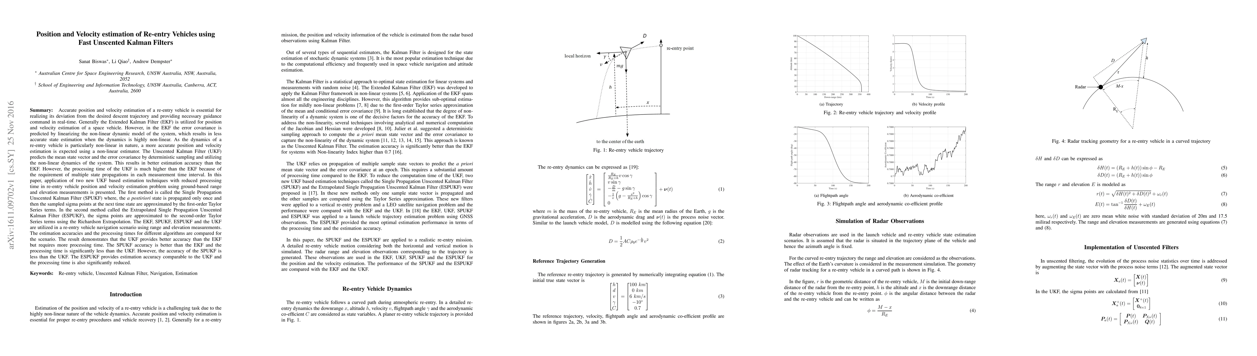 This paper presents two new fast Unscented Kalman Filter (UKF) techniques for estimating the position and velocity of re-entry vehicles using ground-based measurements. The ESPUKF achieves UKF-level accuracy with significantly reduced processing time compared to traditional UKF, while the SPUKF offers better accuracy than the Extended Kalman Filter (EKF) but with lower computational cost.