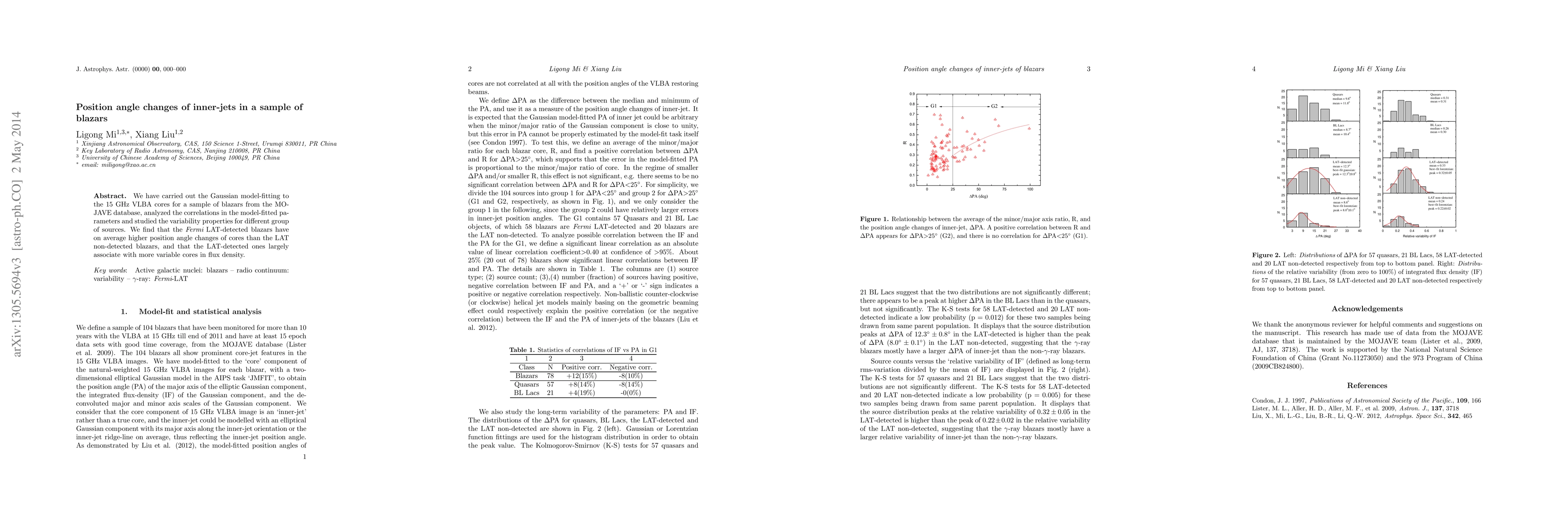 Summary: This study uses Gaussian model-fitting on 15 GHz VLBA cores of blazars to analyze position angle changes and variability. It finds that Fermi LAT-detected blazars exhibit greater position angle changes and higher flux density variability compared to non-detected blazars.