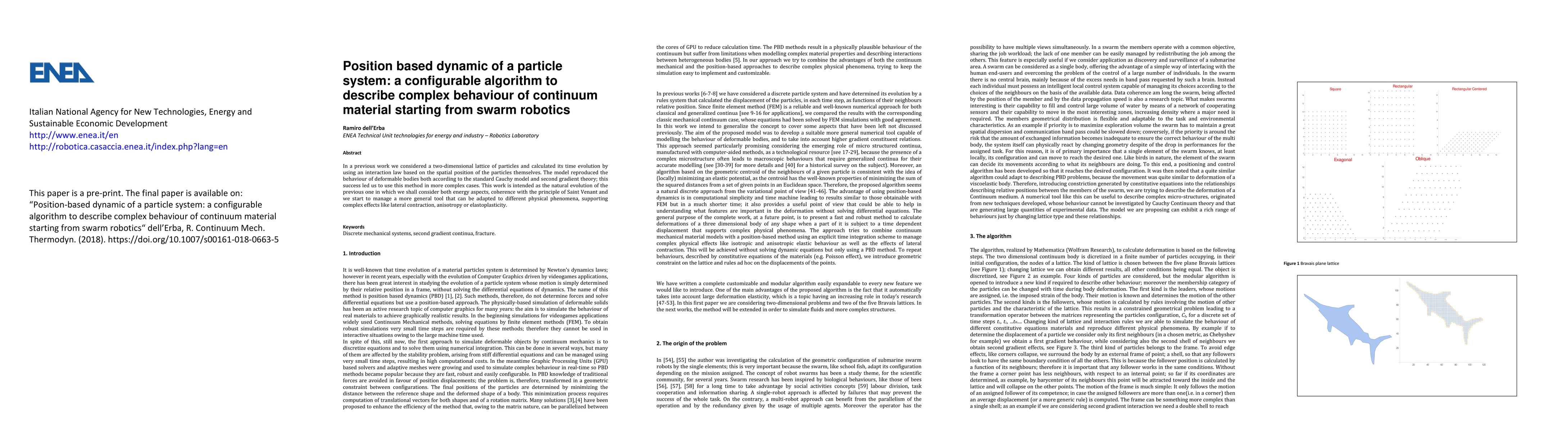 In a previous work we considered a two-dimensional lattice of particles and calculated its time evolution by using an interaction law based on the spatial position of the particles themselves. The model reproduced the behaviour of deformable bodies both according to the standard Cauchy model and second gradient theory; this success led us to use this method in more complex cases. This work is intended as the natural evolution of the previous one in which we shall consider both energy aspects, coherence with the principle of Saint Venant and we start to manage a more general tool that can be adapted to different physical phenomena, supporting complex effects like lateral contraction, anisotropy or elastoplasticity.