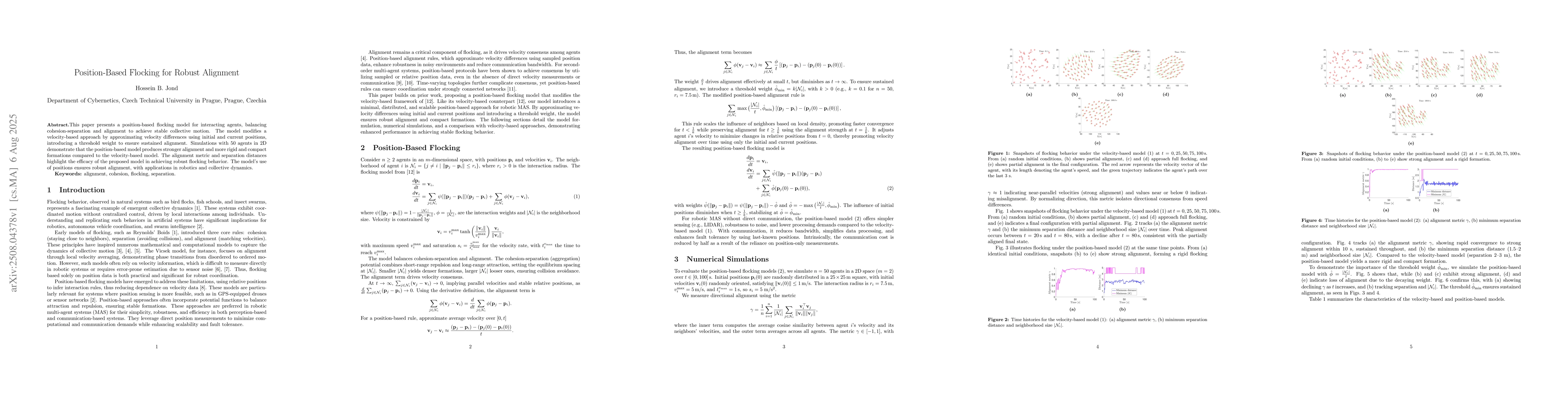 This paper presents a position-based flocking model for interacting agents, balancing cohesion-separation and alignment to achieve stable collective motion. The model modifies a position-velocity-based approach by approximating velocity differences using initial and current positions, introducing a threshold weight to ensure sustained alignment. Simulations with 50 agents in 2D demonstrate that the position-based model produces stronger alignment and more rigid and compact formations compared to the position-velocity-based model. The alignment metric and separation distances highlight the efficacy of the proposed model in achieving robust flocking behavior. The model's use of positions ensures robust alignment, with applications in robotics and collective dynamics.