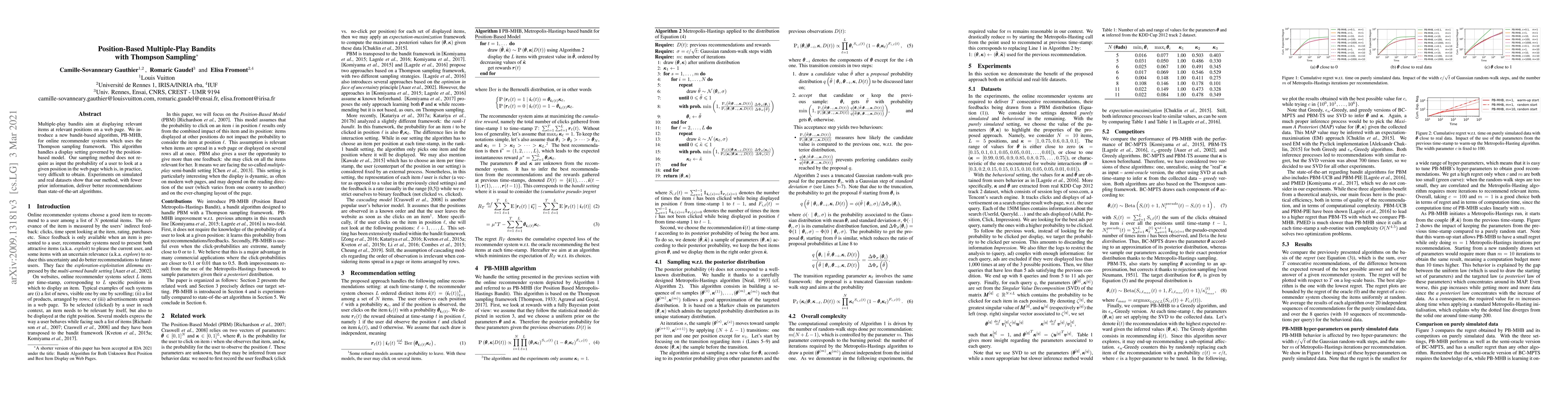 Multiple-play bandits aim at displaying relevant items at relevant positions on a web page. We introduce a new bandit-based algorithm, PB-MHB, for online recommender systems which uses the Thompson sampling framework. This algorithm handles a display setting governed by the position-based model. Our sampling method does not require as input the probability of a user to look at a given position in the web page which is, in practice, very difficult to obtain. Experiments on simulated and real datasets show that our method, with fewer prior information, deliver better recommendations than state-of-the-art algorithms.