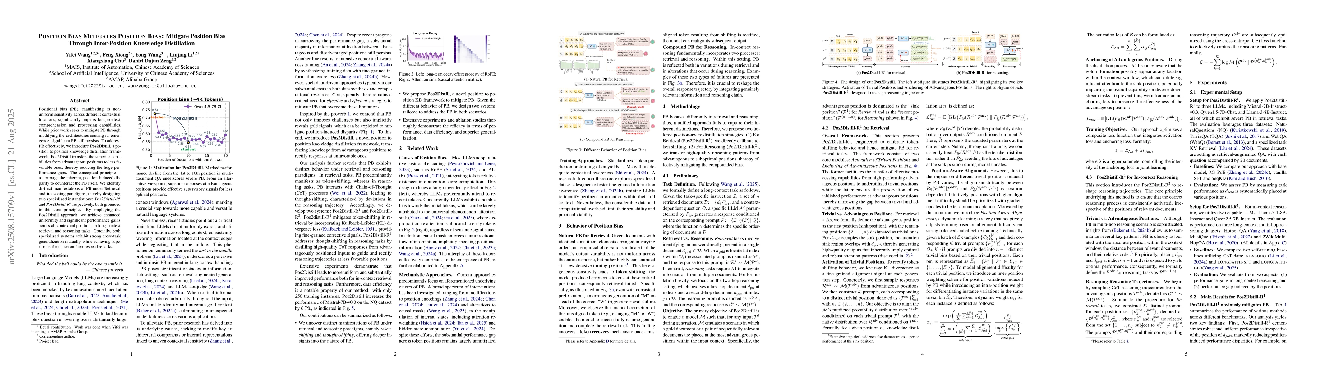 Positional bias (PB), manifesting as non-uniform sensitivity across different contextual locations, significantly impairs long-context comprehension and processing capabilities. While prior work seeks to mitigate PB through modifying the architectures causing its emergence, significant PB still persists. To address PB effectively, we introduce \textbf{Pos2Distill}, a position to position knowledge distillation framework. Pos2Distill transfers the superior capabilities from advantageous positions to less favorable ones, thereby reducing the huge performance gaps. The conceptual principle is to leverage the inherent, position-induced disparity to counteract the PB itself. We identify distinct manifestations of PB under \textbf{\textsc{r}}etrieval and \textbf{\textsc{r}}easoning paradigms, thereby designing two specialized instantiations: \emph{Pos2Distill-R\textsuperscript{1}} and \emph{Pos2Distill-R\textsuperscript{2}} respectively, both grounded in this core principle. By employing the Pos2Distill approach, we achieve enhanced uniformity and significant performance gains across all contextual positions in long-context retrieval and reasoning tasks. Crucially, both specialized systems exhibit strong cross-task generalization mutually, while achieving superior performance on their respective tasks.
