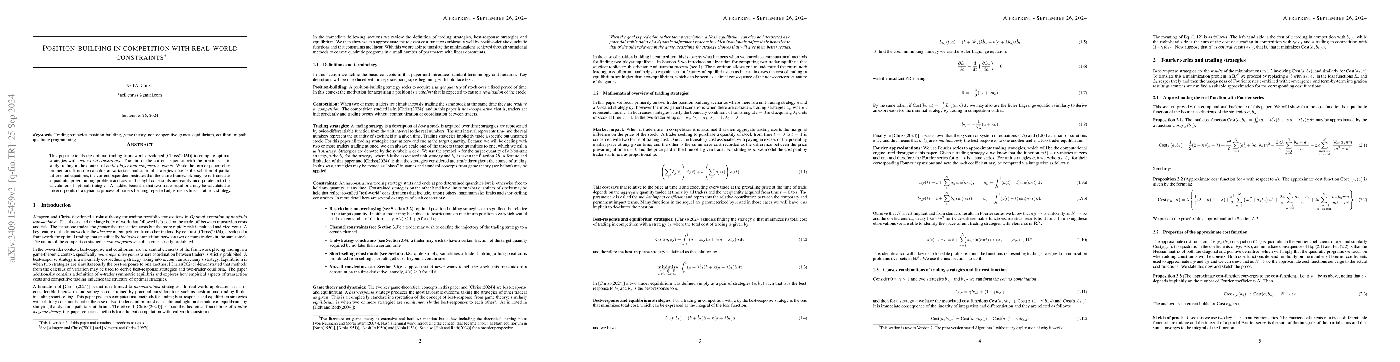 This paper reformulates the optimal-trading framework as a quadratic programming problem to compute strategies under real-world constraints, enabling the inclusion of such constraints directly into the calculation. It also shows that equilibria in a two-trader scenario can emerge from a dynamic adjustment process.
