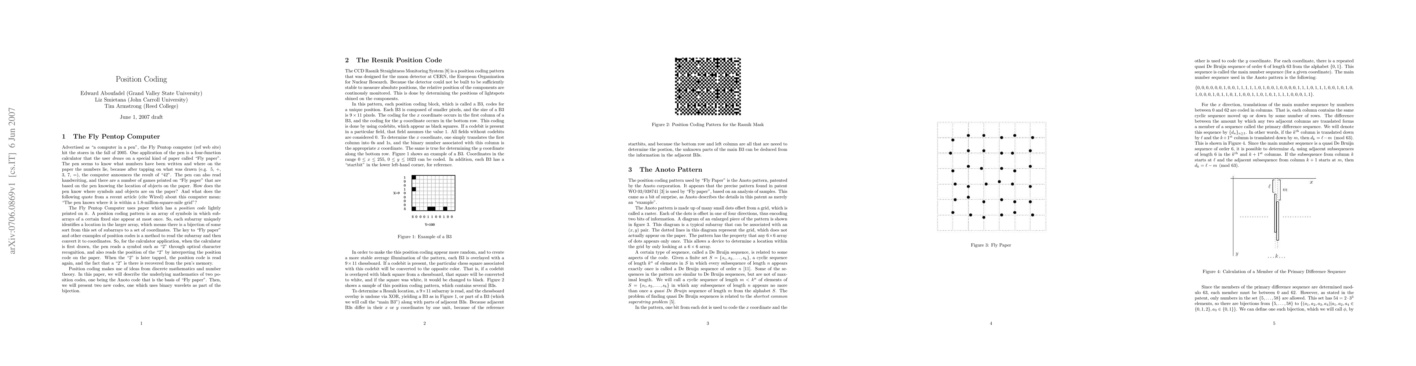 A position coding pattern is an array of symbols in which subarrays of a certain fixed size appear at most once. So, each subarray uniquely identifies a location in the larger array, which means there is a bijection of some sort from this set of subarrays to a set of coordinates. The key to Fly Pentop Computer paper and other examples of position codes is a method to read the subarray and then convert it to coordinates. Position coding makes use of ideas from discrete mathematics and number theory. In this paper, we will describe the underlying mathematics of two position codes, one being the Anoto code that is the basis of "Fly paper". Then, we will present two new codes, one which uses binary wavelets as part of the bijection.