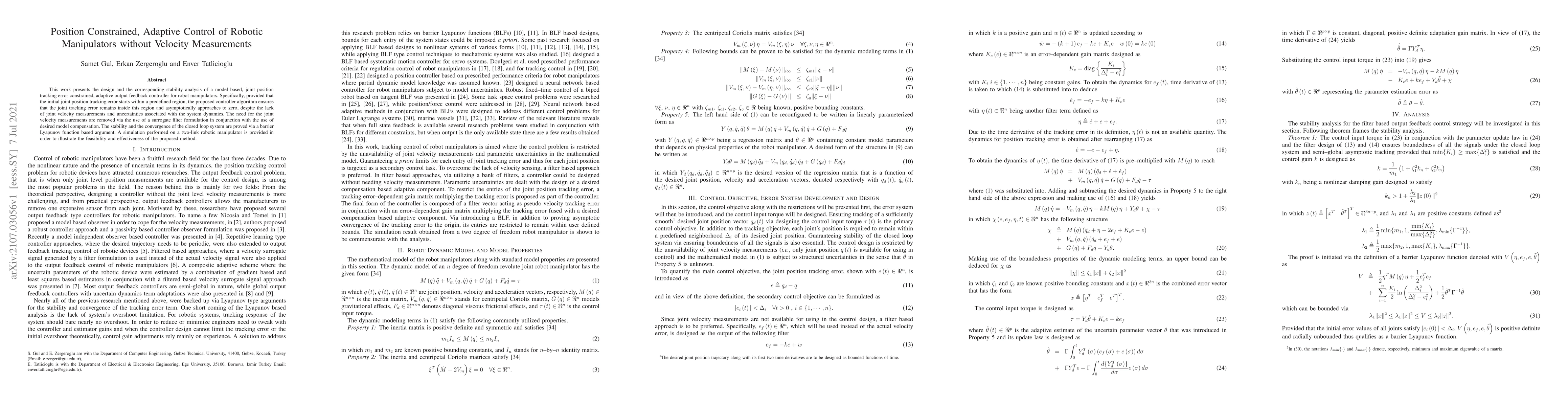This work presents the design and the corresponding stability analysis of a model based, joint position tracking error constrained, adaptive output feedback controller for robot manipulators. Specifically, provided that the initial joint position tracking error starts within a predefined region, the proposed controller algorithm ensures that the joint tracking error remains inside this region and asymptotically approaches to zero, despite the lack of joint velocity measurements and uncertainties associated with the system dynamics. The need for the joint velocity measurements are removed via the use of a surrogate filter formulation in conjunction with the use of desired model compensation. The stability and the convergence of the closed loop system are proved via a barrier Lyapunov function based argument. A simulation performed on a two-link robotic manipulator is provided in order to illustrate the feasibility and effectiveness of the proposed method.