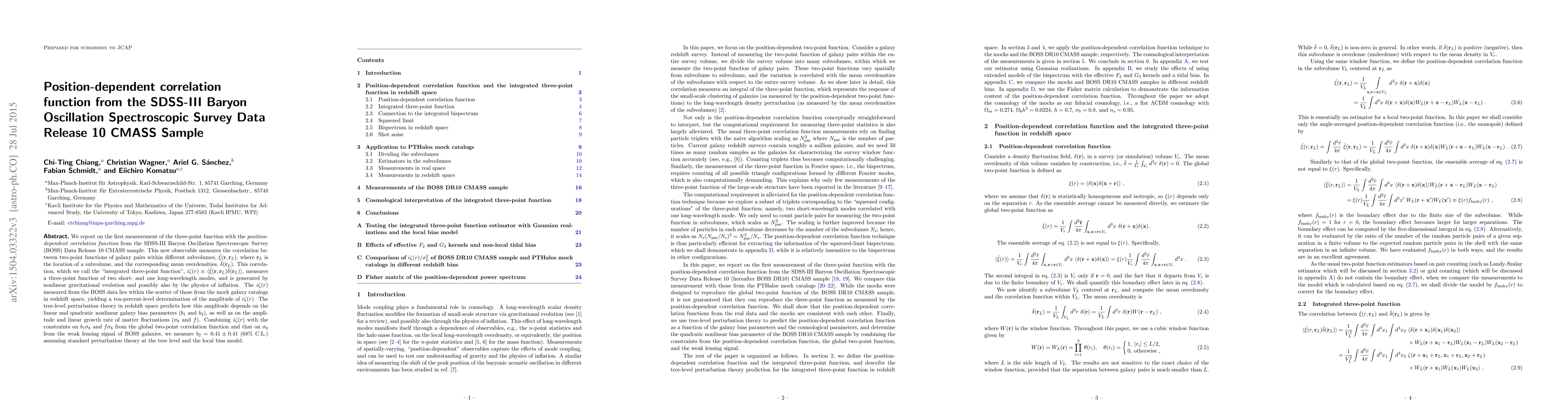 We report on the first measurement of the three-point function with the position-dependent correlation function from the SDSS-III Baryon Oscillation Spectroscopic Survey (BOSS) Data Release 10 CMASS sample. This new observable measures the correlation between two-point functions of galaxy pairs within different subvolumes, $\hat{\xi}({\rm r},{\rm r}_L)$, where ${\rm r}_L$ is the location of a subvolume, and the corresponding mean overdensities, $\bar{\delta}({\rm r}_L)$. This correlation, which we call the "integrated three-point function", $i\zeta(r)=\langle\hat{\xi}({\rm r},{\rm r}_L)\bar{\delta}({\rm r}_L)\rangle$, measures a three-point function of two short- and one long-wavelength modes, and is generated by nonlinear gravitational evolution and possibly also by the physics of inflation. The $i\zeta(r)$ measured from the BOSS data lies within the scatter of those from the mock galaxy catalogs in redshift space, yielding a ten-percent-level determination of the amplitude of $i\zeta(r)$. The tree-level perturbation theory in redshift space predicts how this amplitude depends on the linear and quadratic nonlinear galaxy bias parameters ($b_1$ and $b_2$), as well as on the amplitude and linear growth rate of matter fluctuations ($\sigma_8$ and $f$). Combining $i\zeta(r)$ with the constraints on $b_1\sigma_8$ and $f\sigma_8$ from the global two-point correlation function and that on $\sigma_8$ from the weak lensing signal of BOSS galaxies, we measure $b_2=0.41\pm0.41$ (68% C.L.) assuming standard perturbation theory at the tree level and the local bias model.