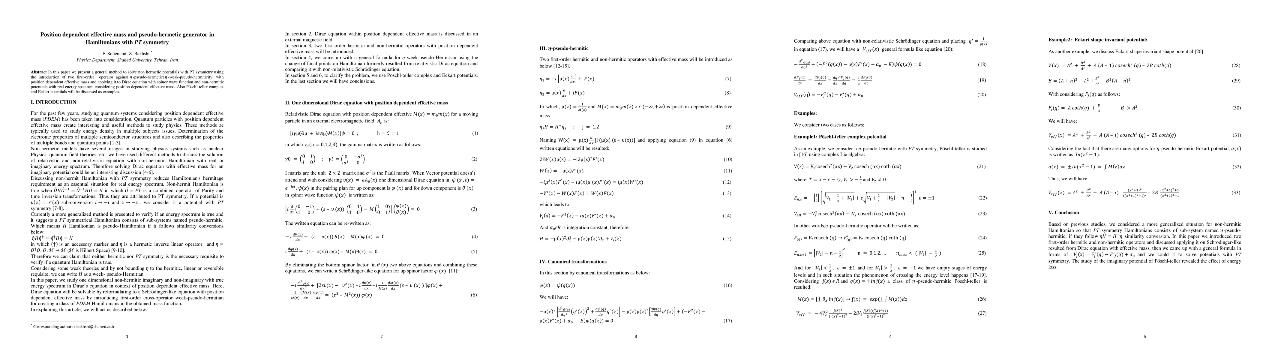 This paper introduces a method to solve non-Hermitian potentials with PT symmetry using η-pseudo-hermiticity and a position-dependent effective mass, applied to the Dirac equation with spinor wave functions. Examples include P\"oschl-Teller and Eckart potentials.