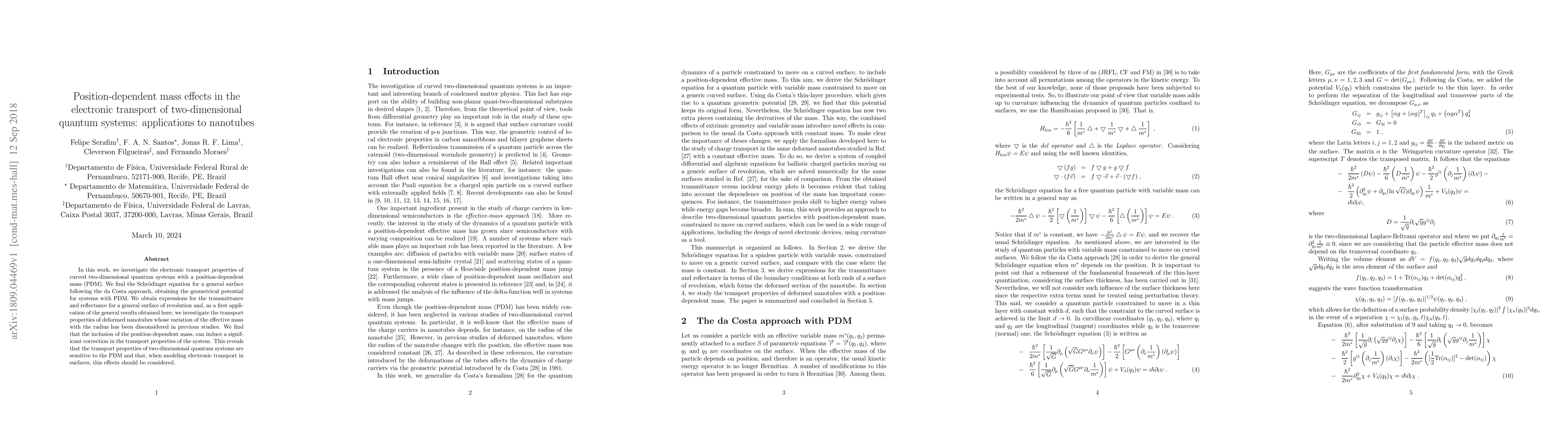 This paper explores the electronic transport in two-dimensional quantum systems with position-dependent mass, revealing significant changes in transport properties due to mass variations. The study applies these findings to deformed nanotubes, highlighting the importance of considering position-dependent mass in modeling electronic transport.
