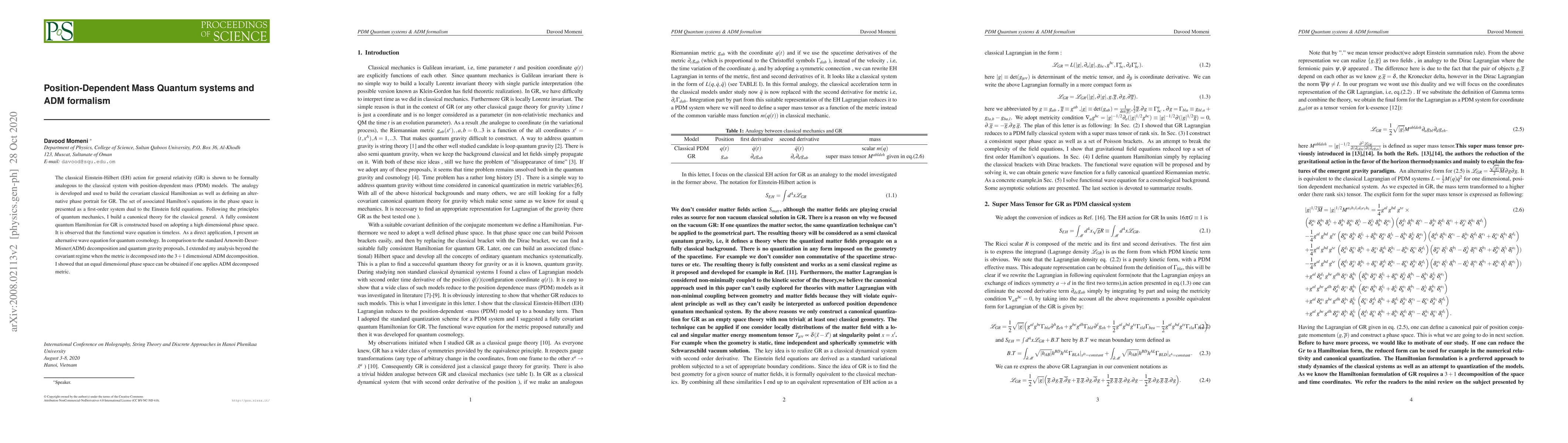 This paper explores the analogy between classical general relativity and position-dependent mass systems to construct a covariant Hamiltonian for GR. It extends the analysis beyond the standard ADM decomposition, proposing an alternative wave equation for quantum cosmology and demonstrating a consistent quantum Hamiltonian in a high-dimensional phase space.