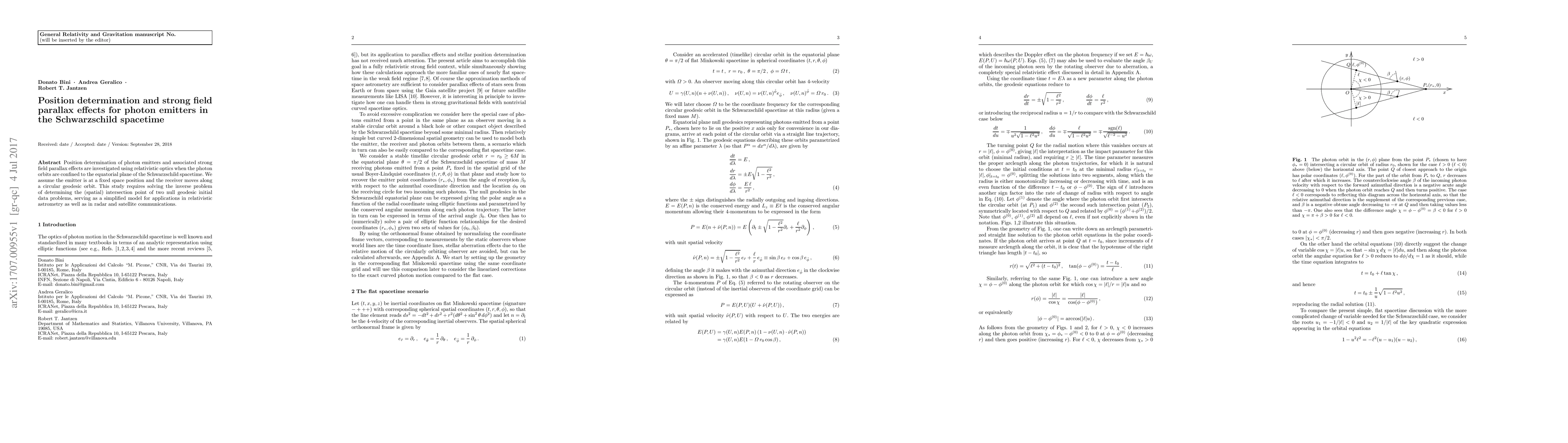 Position determination of photon emitters and associated strong field parallax effects are investigated using relativistic optics when the photon orbits are confined to the equatorial plane of the Schwarzschild spacetime. We assume the emitter is at a fixed space position and the receiver moves along a circular geodesic orbit. This study requires solving the inverse problem of determining the (spatial) intersection point of two null geodesic initial data problems, serving as a simplified model for applications in relativistic astrometry as well as in radar and satellite communications.