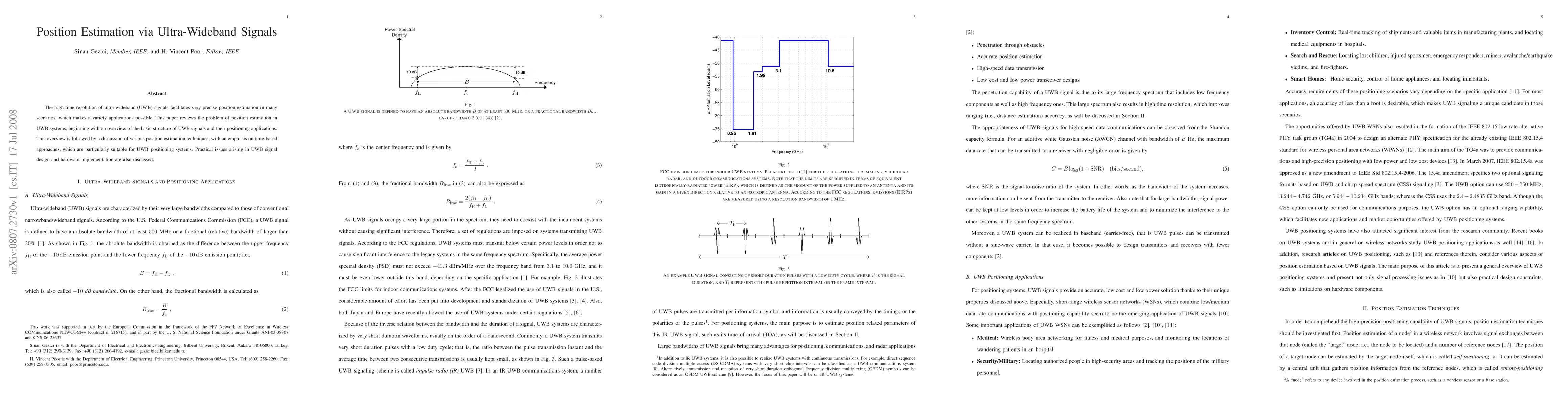 This paper reviews ultra-wideband (UWB) signal-based position estimation, highlighting time-based techniques for precise positioning and addressing practical design and implementation challenges. It provides an overview of UWB signal structure and its applications in positioning systems.